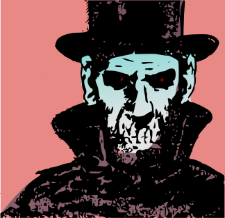 This features a man wearing a top hat and a long black coat, with his face painted to look like a skeleton. He has a menacing expression on his face, giving the impression of being evil or scary. The man's outfit is reminiscent of Dr. Death from the comic book "The Sandman." The overall atmosphere of the image is dark and eerie, with the man's appearance as the focal point.