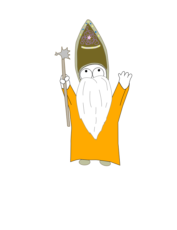 This features a cartoon character, possibly a wizard or sorcerer, dressed in an orange robe and holding a wand. He appears to be greeting the gods with his arms raised high above his head. The character is depicted as having a long white beard, which adds to his wise and ancient appearance. The overall scene has a whimsical and fantastical feel to it, likely intended for entertainment or artistic purposes.