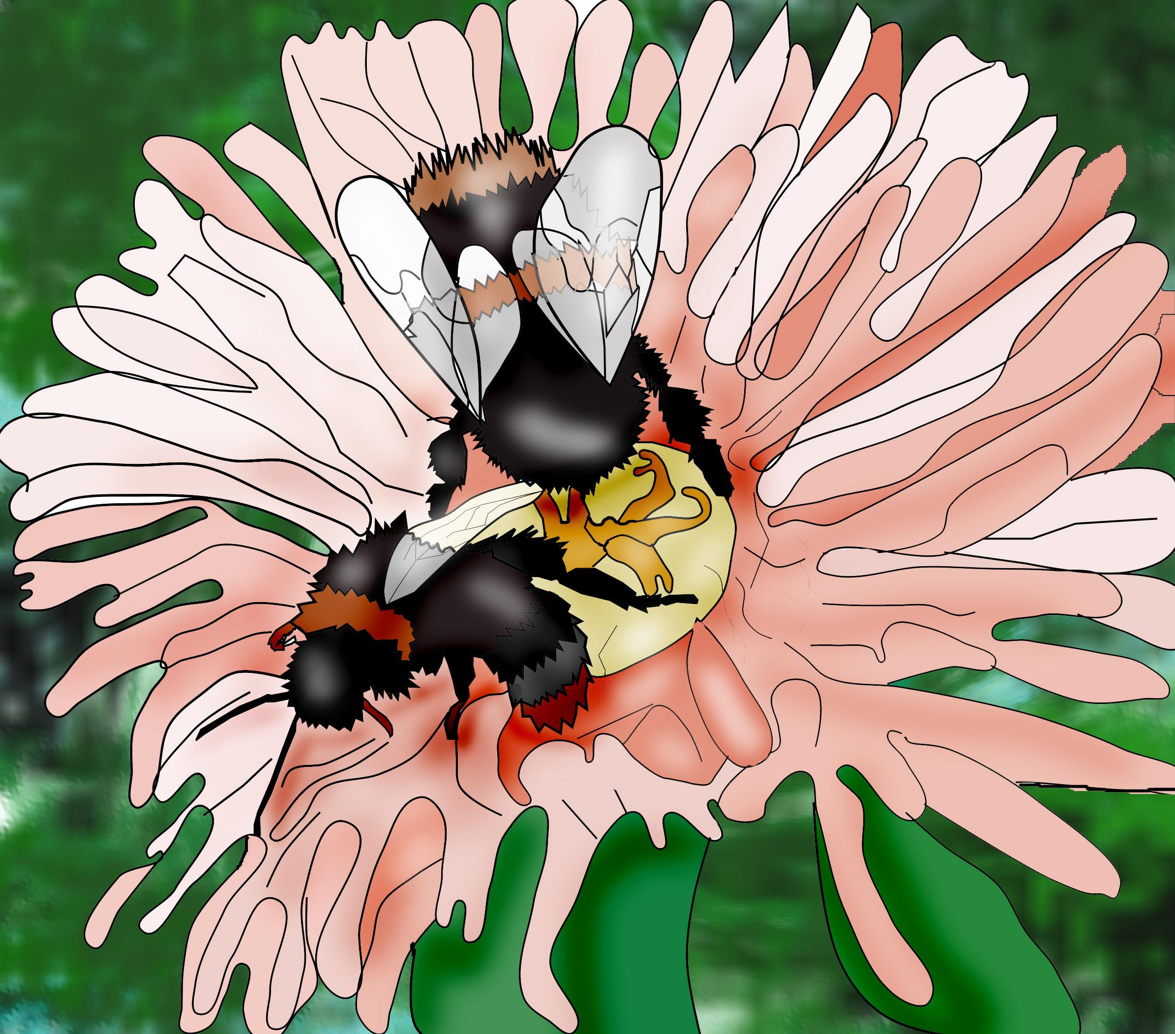 This features a beautifully drawn illustration of two bees on the petals of a pink flower. One bee is positioned towards the left side of the flower, while the other is situated more towards the center. Both bees are engaged in feeding off the nectar from the flower, creating an artistic and captivating scene. The vibrant colors of the flower and the intricate details of the bees make this image a delightful piece of artwork.