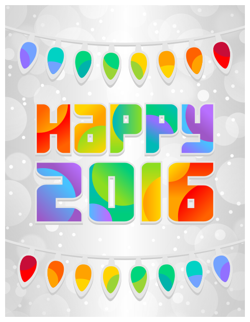 This features a Happy New Year poster with the words "Happy 2016" written in colorful letters. These letters are adorned with various colored lights, creating an eye-catching and festive appearance. The poster is set against a white background that contrasts nicely with the vibrant colors of the text and lights. This cheerful design would make for a great decoration during the holiday season or as a personalized greeting card to celebrate the new year.