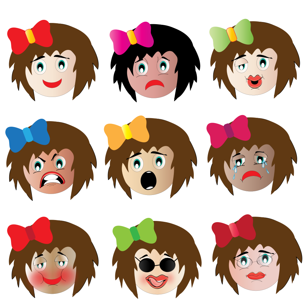 This features a collection of cartoon faces with various expressions, all wearing bows in their hair. There are nine different faces displayed, each with distinctive emotions and facial features. The bows on the girls' heads come in a variety of colors, adding visual interest to the overall composition. Each face is accompanied by a corresponding bow, making it easy for viewers to identify which expression belongs to which character. This creative display showcases the versatility of these cartoon characters and their ability to convey different emotions through their facial expressions and accessories.