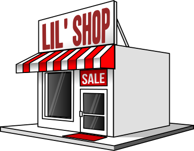 This features a white building with red and white striped awnings, which is the exterior of a shop called Lily's Shop. The store has one window and door, making it easy for customers to enter or exit. Above the door, there is a sale sign that indicates any ongoing promotions or discounts inside the store. The overall appearance of the building gives off a welcoming and inviting atmosphere for potential shoppers.
