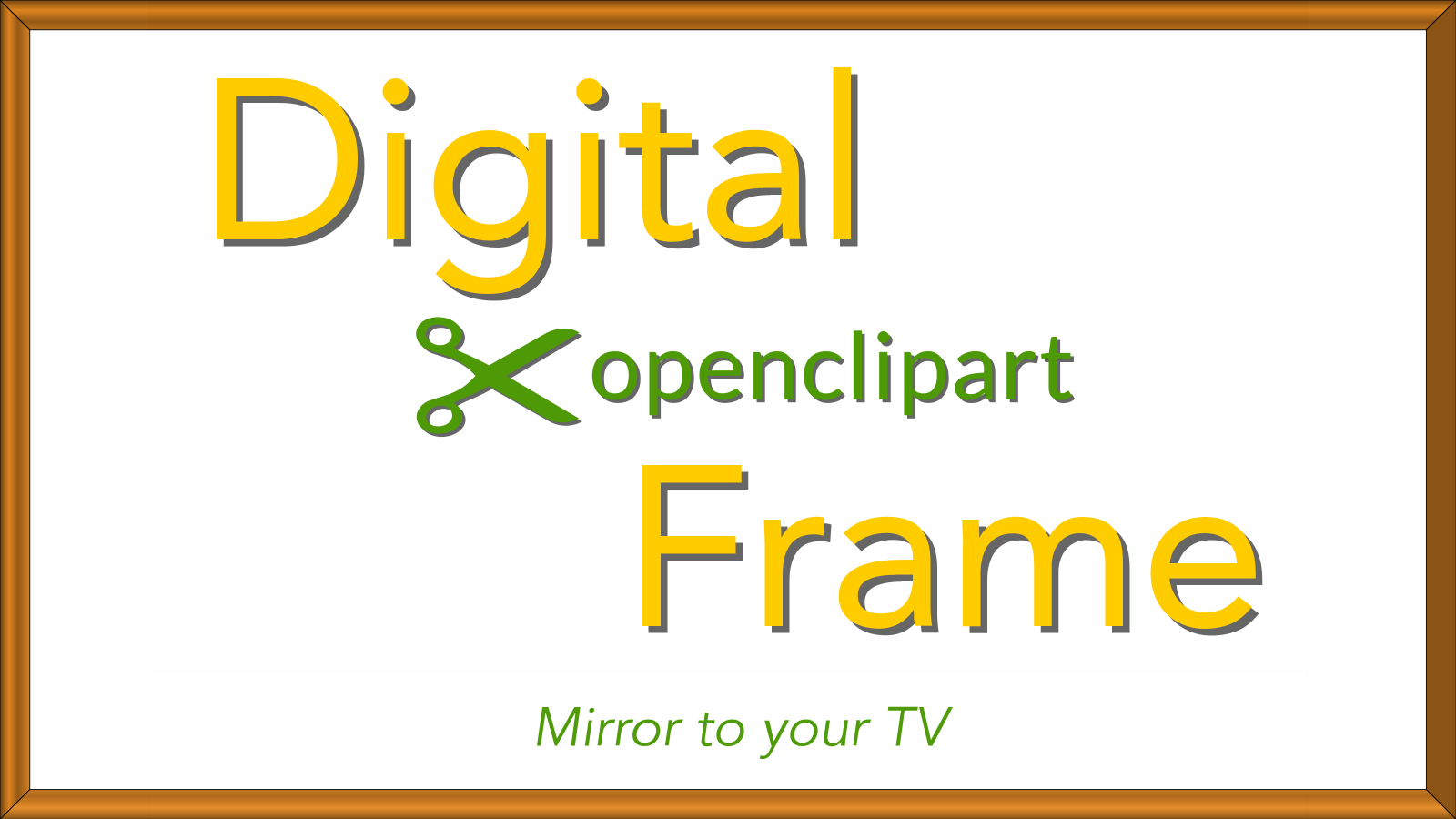This features a sign that says "Digital Openclipart Frame" with a picture of scissors on it. This sign is likely advertising a digital frame that uses openclipart images to create a unique and personalized display for the user's television or other devices. The frame allows users to select their desired images from the openclipart database, which provides a wide range of artwork options. Users can also customize the appearance of the frame by adjusting various parameters such as the number of images displayed, the aspect ratio, and even the background color. This digital openclipart frame offers a creative way to enhance the visual appeal of one's living space while showcasing personal taste and style.