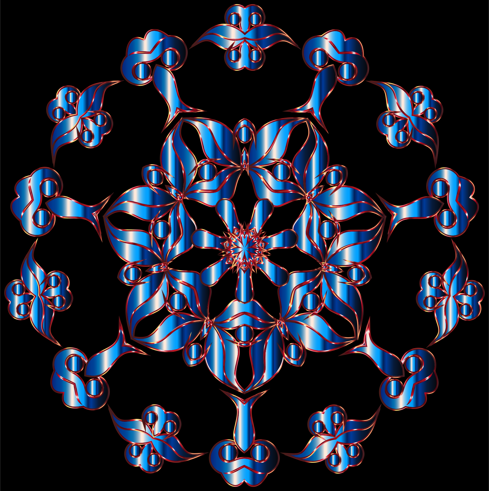 This features a large, intricate design made up of various shapes and colors. It appears to be an artistic representation of a flower or a pattern with multiple petals. The design is composed of different shades of blue, red, and gold, creating a visually striking contrast against the black background. The overall effect is that of a vibrant and captivating piece of artwork.
