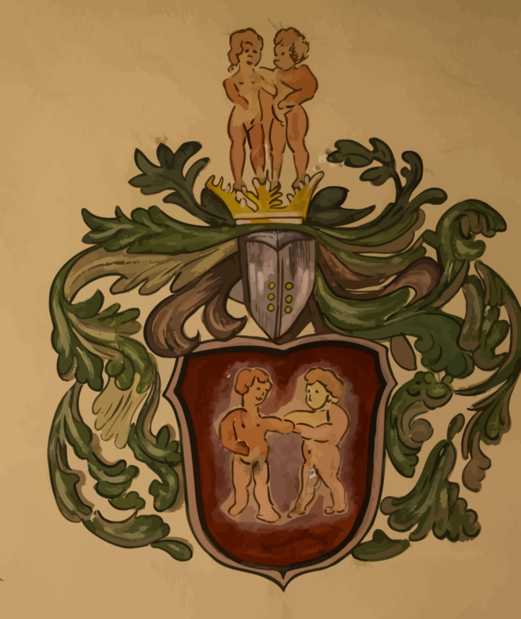 This features a coat of arms with two naked men standing next to each other. They are positioned in the center of the emblem, and their bodies appear to be intertwined as if they are dancing or embracing. The coat of arms is adorned with various decorative elements such as leaves, flowers, and a crown. There are also two swords present on either side of the men, adding an element of strength and protection to the design. Overall, this intricate emblem showcases a sense of unity and harmony between the two figures.