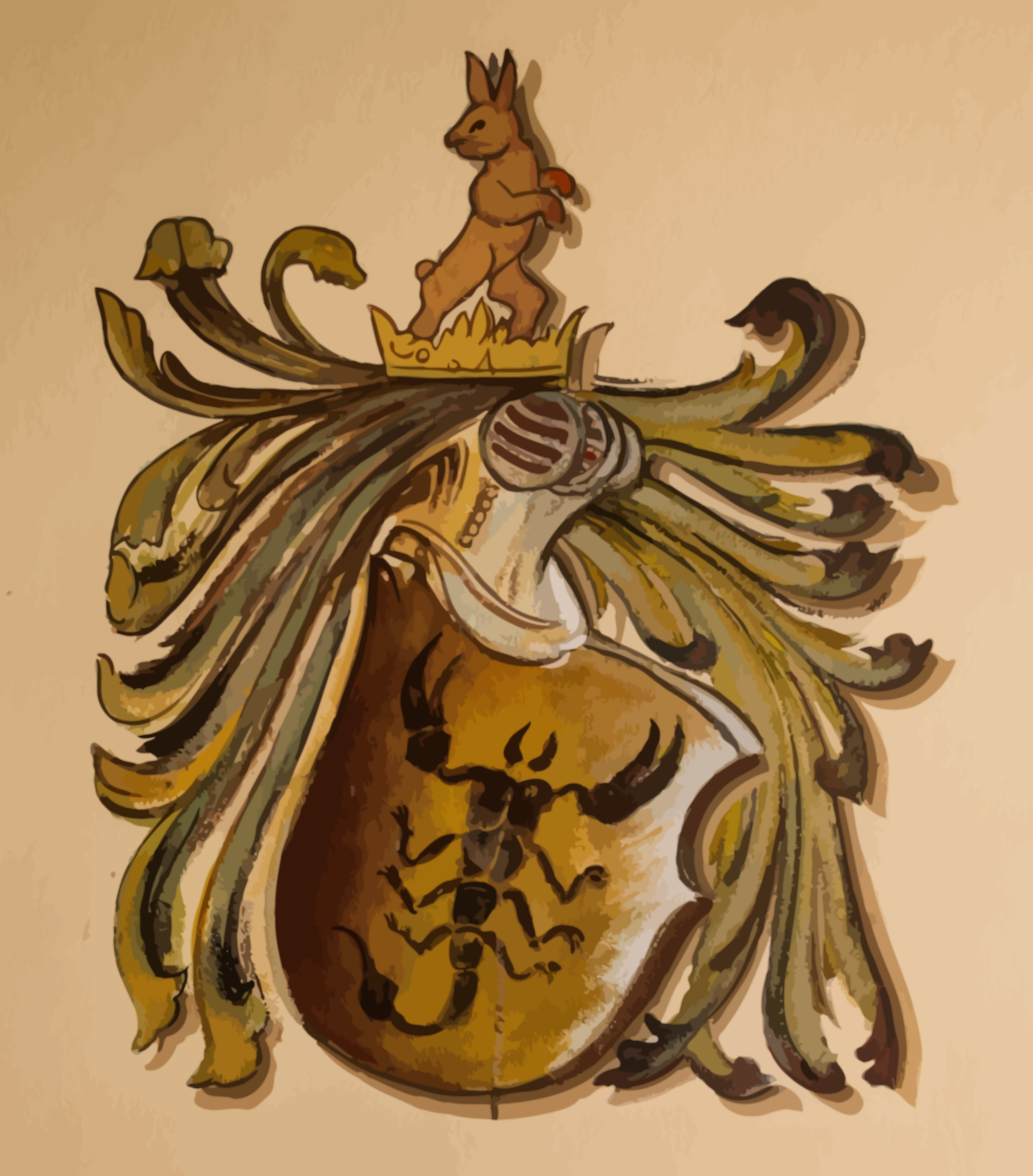 This features a unique and intricate design that combines elements of nature, art, and mythology. At the center of this design is an egg-shaped object with a crab on it, surrounded by various plants and flowers. Above the egg, there's a rabbit figure holding a crown, adding to the overall whimsical and imaginative theme of the piece. The artwork also includes a skull, which further enhances its mystical appeal. This creative design is likely inspired by ancient mythology or symbolism, making it an interesting focal point for any space where it's displayed.