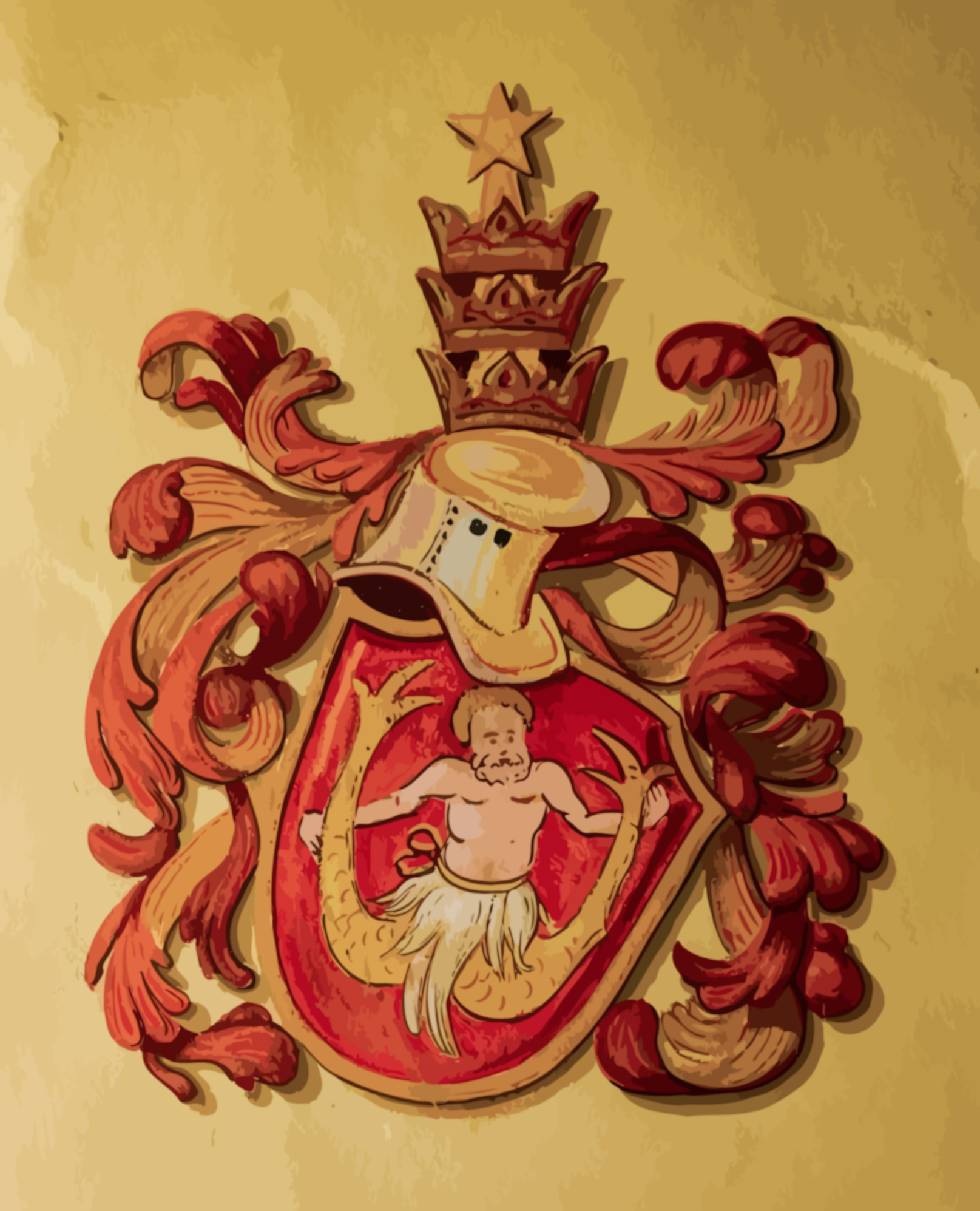 This features a decorative emblem with an intricate design, including a crown and a star. The emblem is adorned with a red background and has a gold color scheme. In the center of the emblem, there is a figure of a man wearing a helmet, giving it a unique and artistic appearance. The overall design showcases an impressive level of detail and craftsmanship, making it an eye-catching piece of artwork.