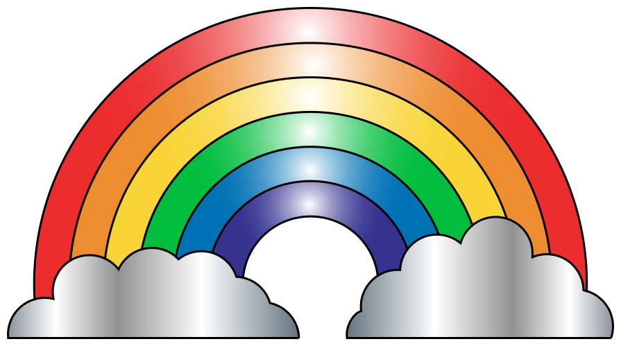 This features a large, colorful rainbow with six distinct colors. It is positioned above two clouds, creating an eye-catching and vibrant scene. The rainbow spans the entire width of the image, from one cloud to another, making it a striking visual element in the picture.