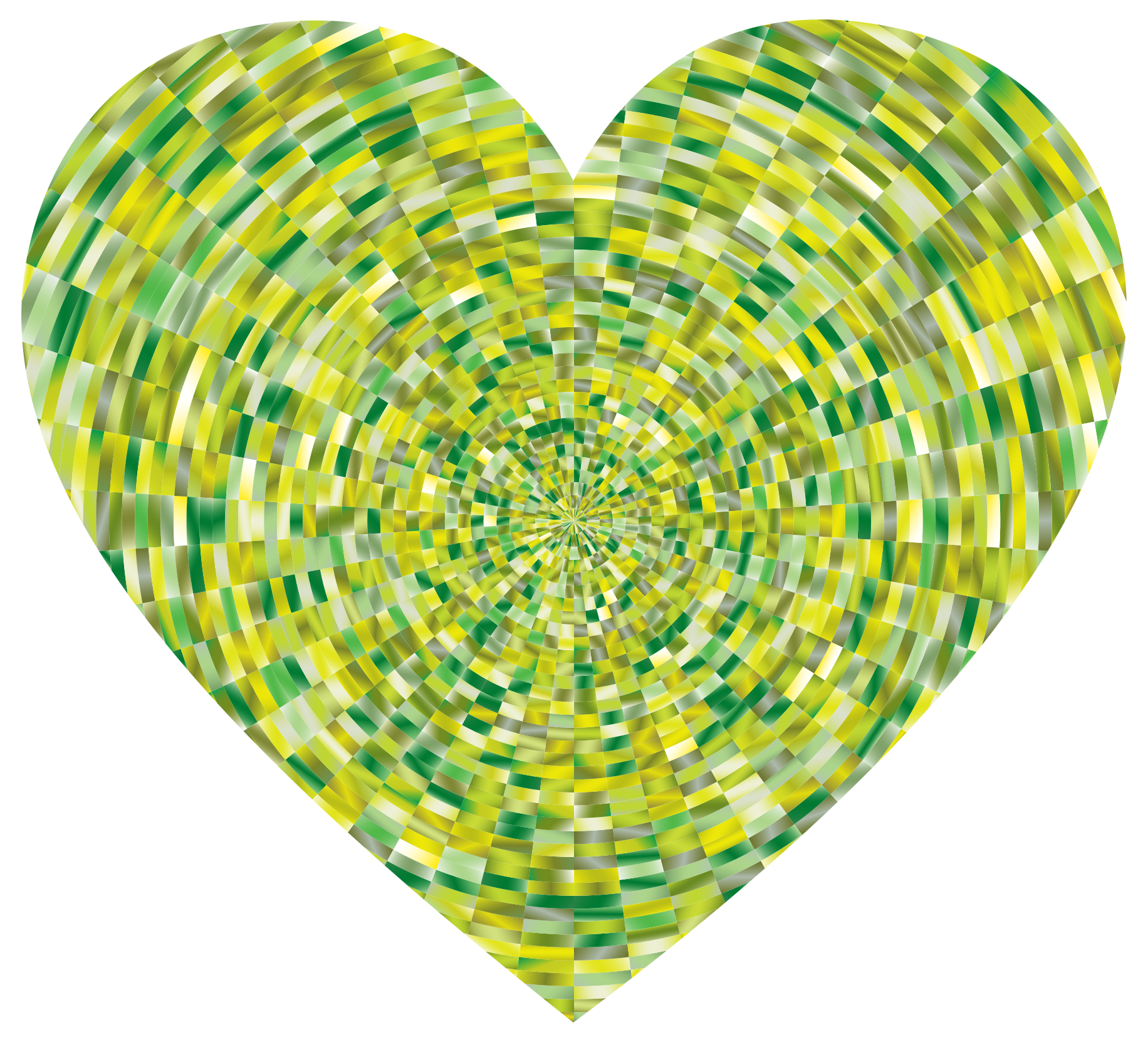 This features a heart-shaped design with a yellow and green color scheme. The heart is made up of many small squares, creating an intricate pattern that resembles a spiral or vortex. The colors are predominantly yellow and green, giving the heart a vibrant and lively appearance. The close-up view of the heart allows for a detailed examination of its unique design elements, making it an interesting visual piece.