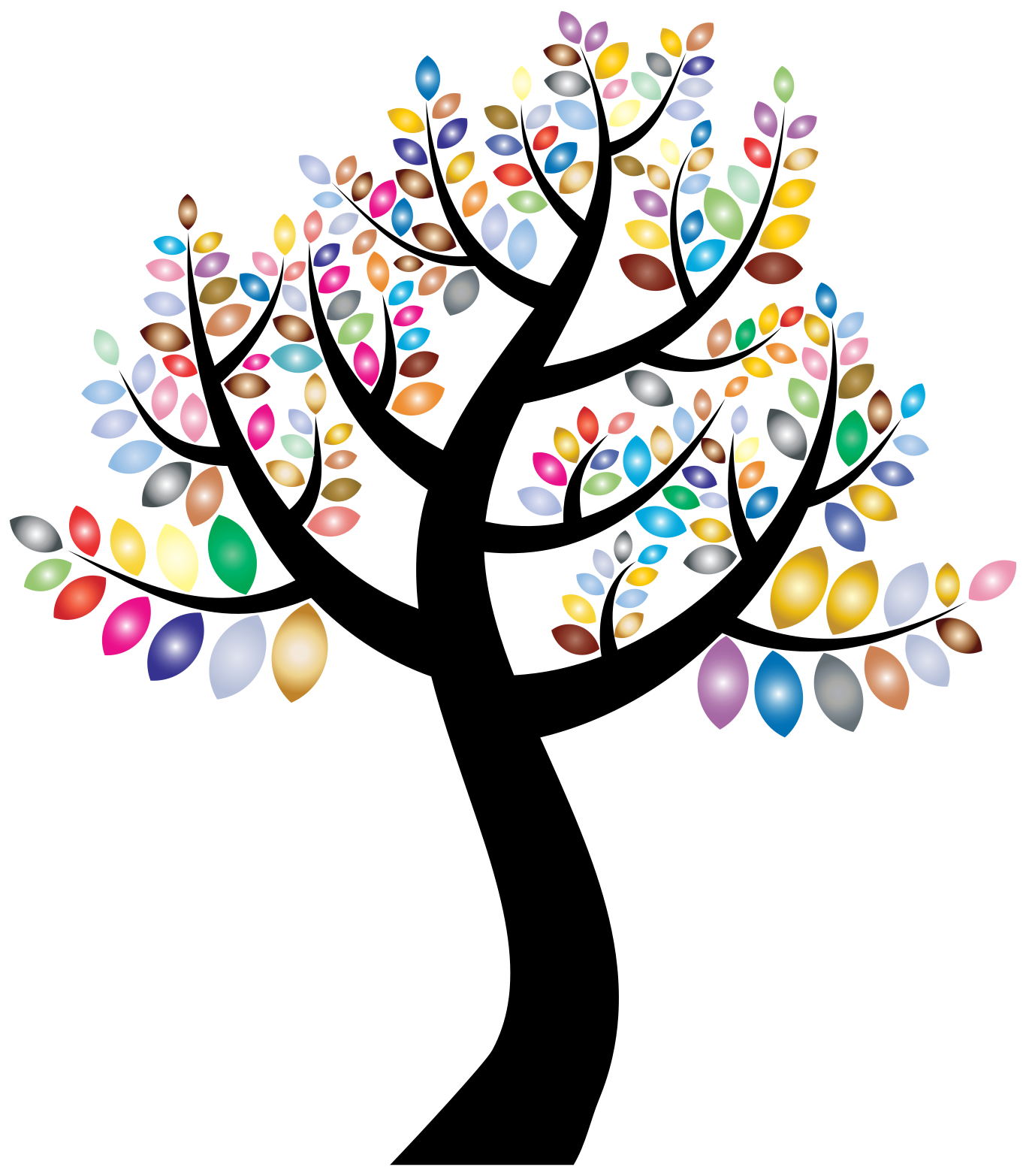 This features a black and white tree with colorful leaves. The tree is adorned with various colored leaves, including yellow, orange, green, pink, blue, purple, red, and white. These leaves are scattered throughout the tree, creating a vibrant and lively scene. The tree appears to be a focal point in the image, drawing attention to its unique and colorful appearance.
