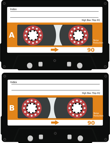 This features two cassette tapes placed side by side, each with a different label. The top cassette is labeled "A" and the bottom one is labeled "B." Both tapes have red circles in the center, which are likely to be used for holding the cassettes together or as decoration. The labels on the tapes indicate that they may contain music or other audio recordings.