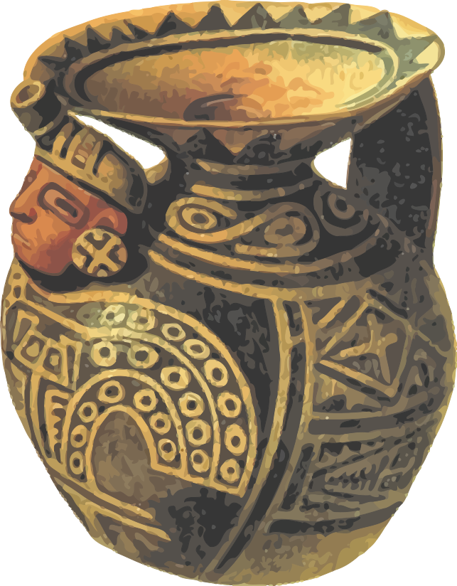 This features a large, ornate vase with intricate designs and patterns on it. It is adorned with a Native American head, adding to its cultural significance. The vase has a wide mouth and is made of clay, giving it an earthy appearance. The combination of the head, geometrical shapes, and decorative elements make this pottery piece unique and visually appealing.