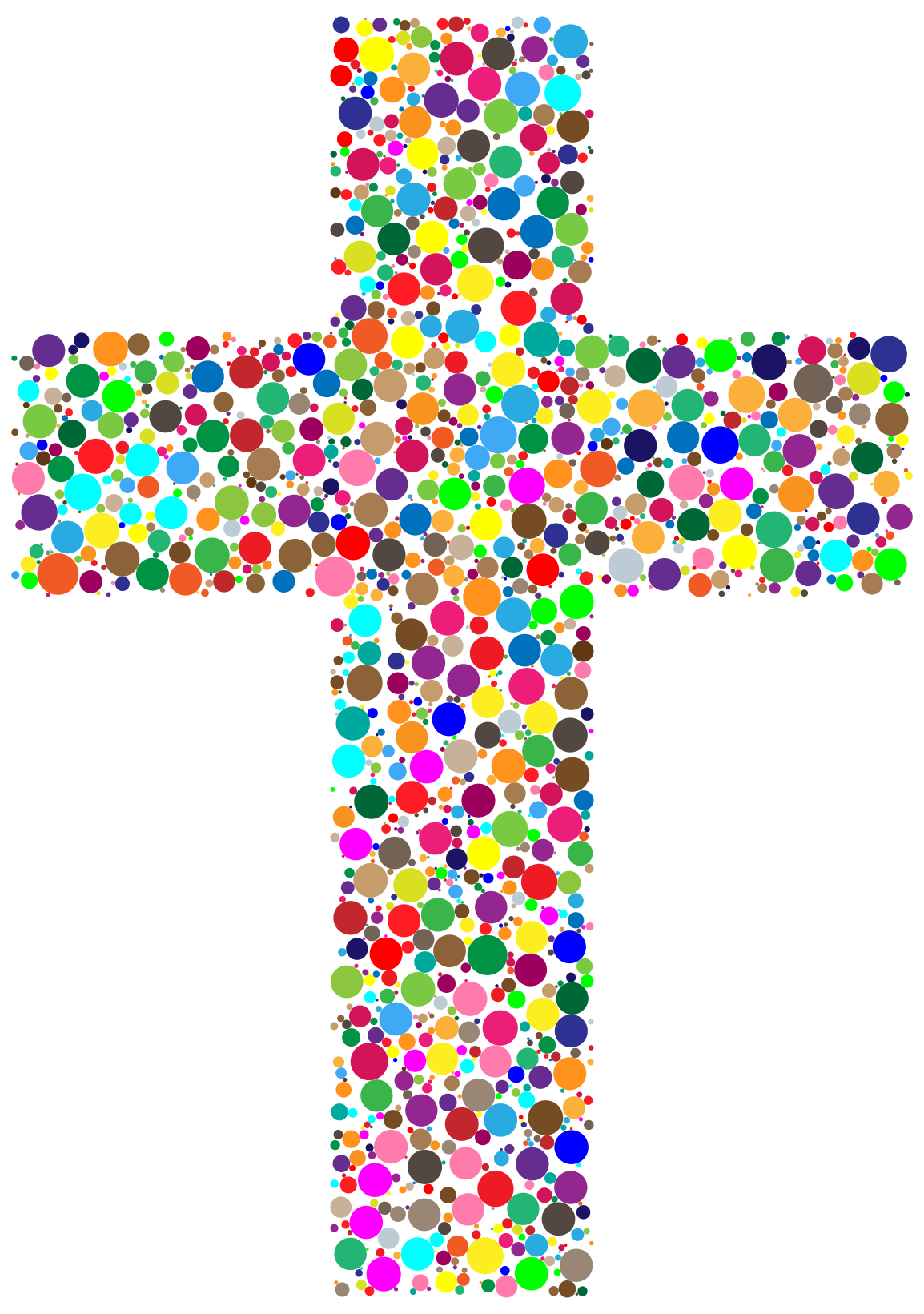 This features a large, colorful cross made up of many small circles. These circles are scattered all over the cross in various colors and sizes, creating an eye-catching and vibrant display. The cross is prominently displayed on a white background, drawing attention to its unique design. This artistic representation of the cross may be used for decorative purposes or as a symbolic representation of faith.