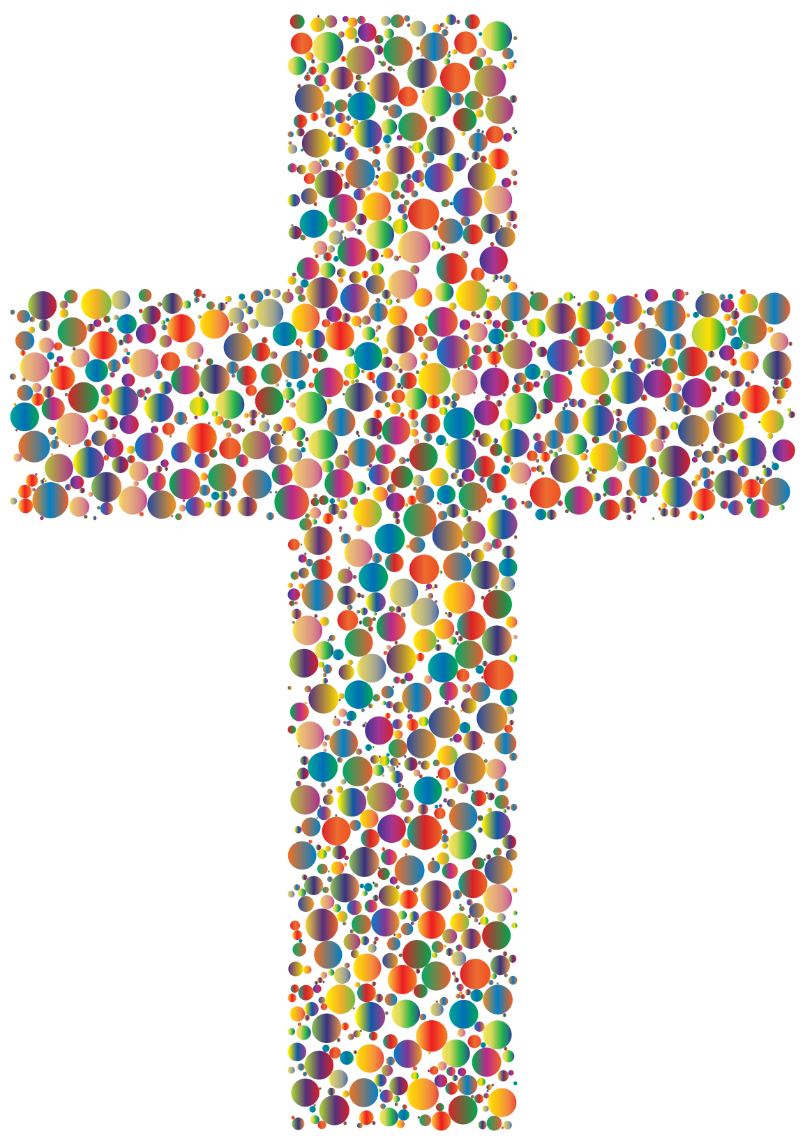 This features a large, colorful cross made up of many small circles. These circles are arranged in various shapes and sizes, creating an intricate pattern that covers the entire cross. The colors used for the circles include red, green, blue, yellow, orange, and purple, making it a visually striking piece of artwork. The cross is displayed on a white background, which allows the vibrant colors to stand out even more prominently. This unique design showcases creativity and attention to detail in its execution.