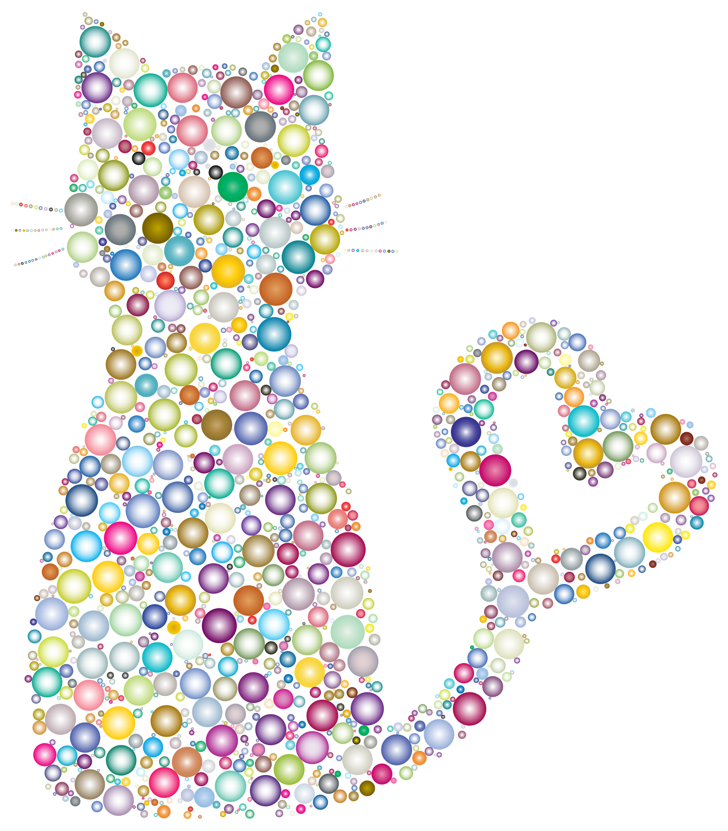 This features a cat with a heart-shaped tail, made up of many small flowers in different colors. These colorful flowers are scattered all over the cat's body, creating an eye-catching and vibrant display. The cat is positioned on a white background, which allows the brightly colored flowers to stand out even more. This unique design showcases the creativity of the artist who crafted this image.