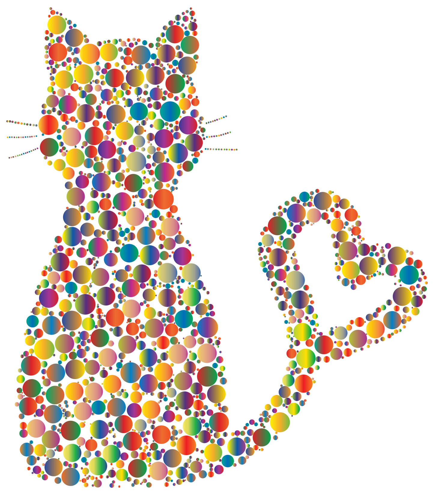 This features a colorful cat with a heart-shaped tail. The cat is made up of various colored dots, creating a visually appealing and playful representation. The cat's body is filled with different shades of colors, while the heart-shaped tail stands out as an eye-catching element in the scene. This unique design showcases creativity and artistic expression through the use of colorful dots to create a captivating image of a feline.