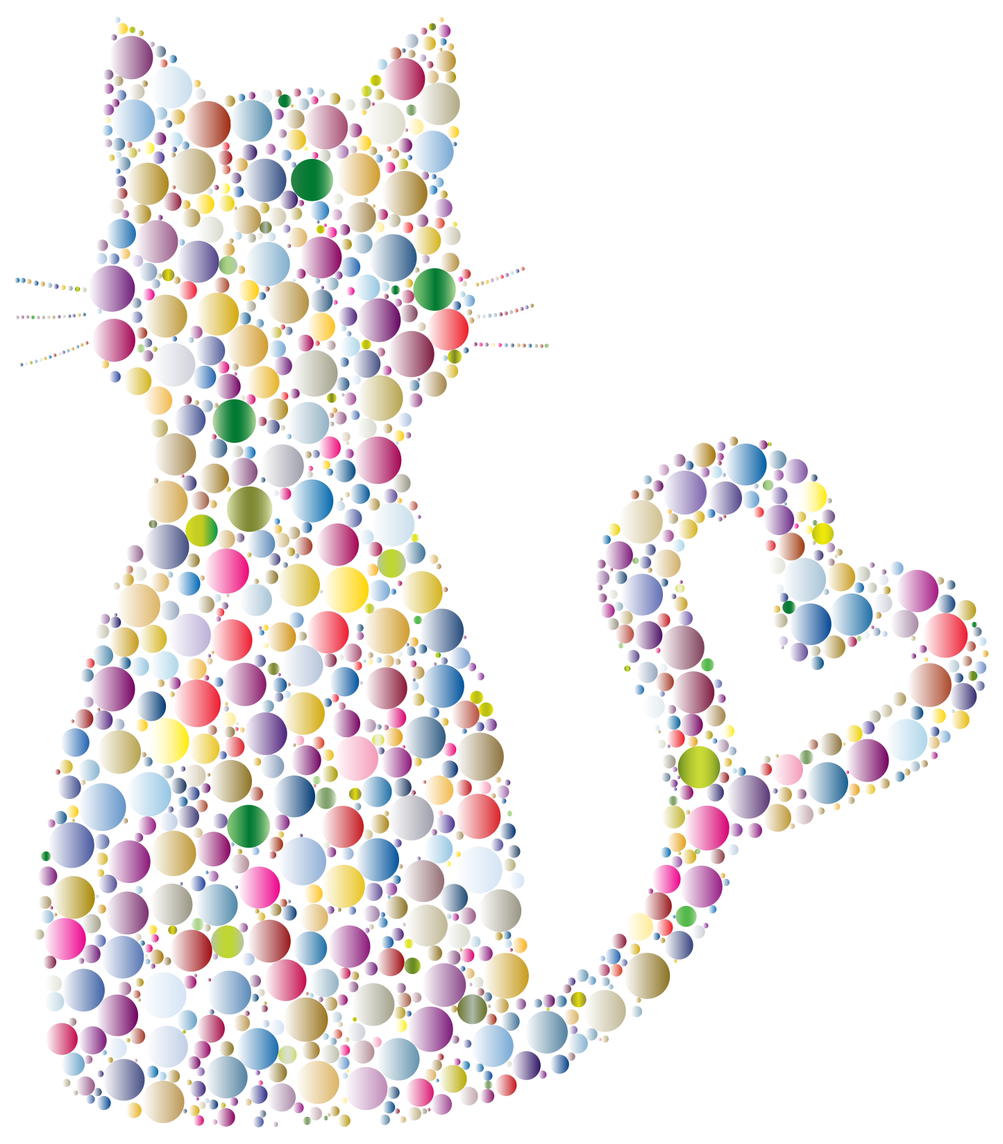 This features a cat with its body made up of small, colorful circles. These circles are scattered all over the cat's body, creating an interesting and visually appealing design. The cat is depicted in various colors, including yellow, pink, green, blue, and orange. In addition to the main cat, there is a heart-shaped tail that adds a playful touch to the overall composition of the illustration. This unique artwork showcases creativity and attention to detail, making it an eye-catching piece for any cat lover or art enthusiast.