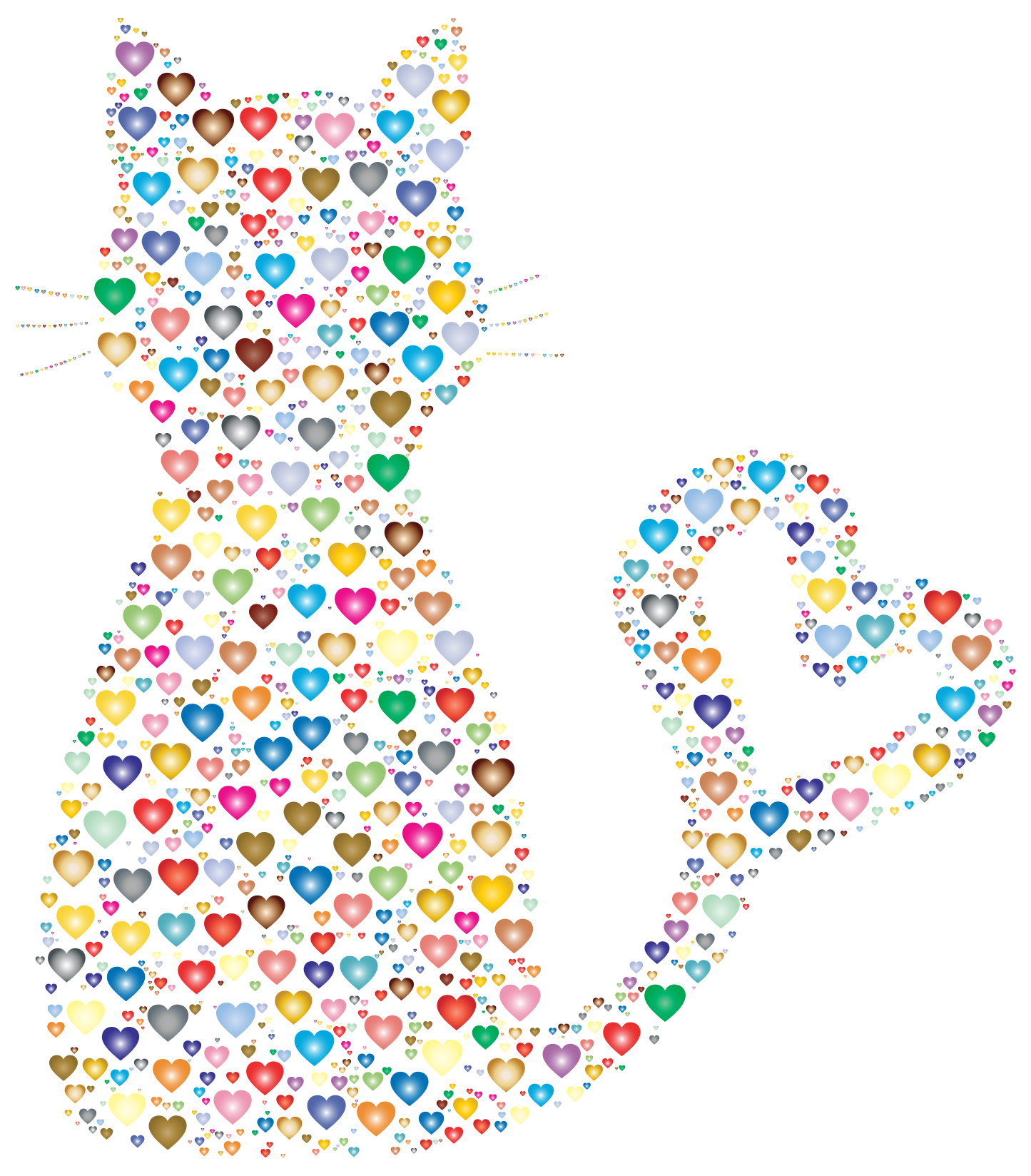 This features a large, colorful cat with hearts all over its body. The heart-shaped pattern is scattered across the cat's fur in various sizes and colors, creating an eye-catching and playful visual effect. The cat appears to be the main focus of the scene, as it stands out against the white background. This unique design could be used for a variety of purposes such as a decorative piece or even as a creative way to showcase love for cats.