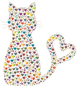 This features a cat made out of hearts, with its body and tail shaped like a heart. The hearts are small and come in various colors, creating a visually appealing design. The cat is positioned on a white background, which allows the hearts to stand out even more. This unique representation of a cat showcases creativity and artistic expression through the use of hearts as its primary elements.
