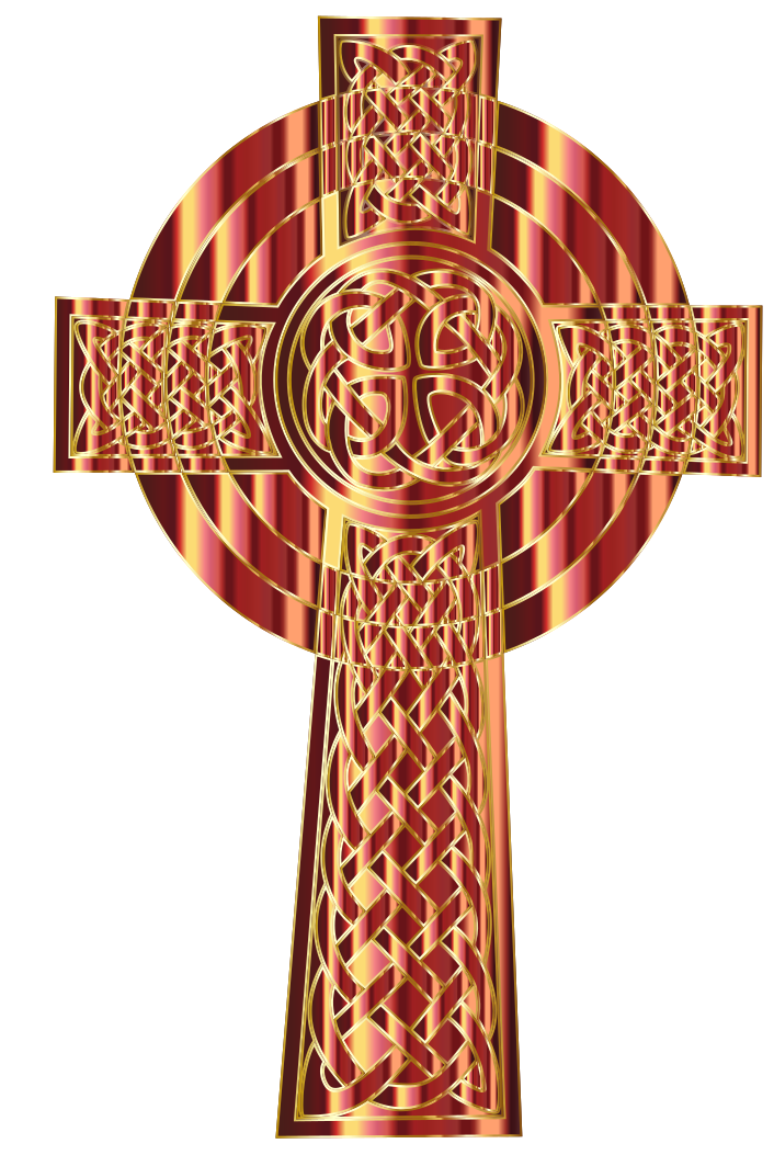 This features a beautifully crafted, ornate cross made of gold and brown colors. It is adorned with intricate patterns that give it an elegant appearance. The cross has a circular design at the top, adding to its visual appeal. This prismatic celtic cross stands out as a symbol of faith and spirituality, making it an impressive piece for display or use in religious ceremonies.