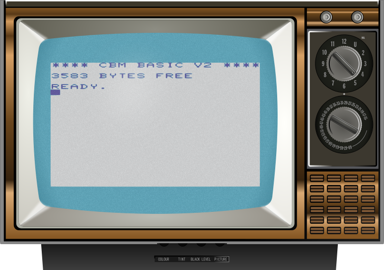 This features an old-fashioned television set with a blue screen. On the screen, there is a message that reads "free 6438 bytes free". This vintage TV has two volume and program wheels on its side, which are used to control the settings of the television. The overall appearance of the television suggests it's from an earlier era, possibly dating back to the 1970s or 1980s.
