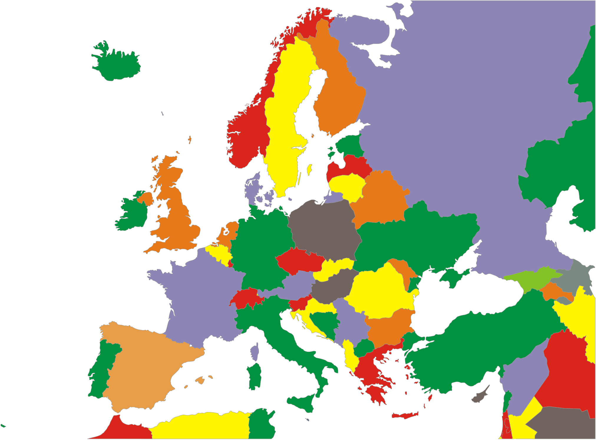 This is a colorful map of Europe, featuring various countries and their corresponding colors. The countries are represented by different colored shapes or symbols, making it easy to identify each country's location on the continent. The map covers most of Europe, including countries such as France, Germany, Italy, Spain, and many others. The vibrant colors used in the map make it visually appealing and engaging for viewers who are interested in learning about or exploring European geography.