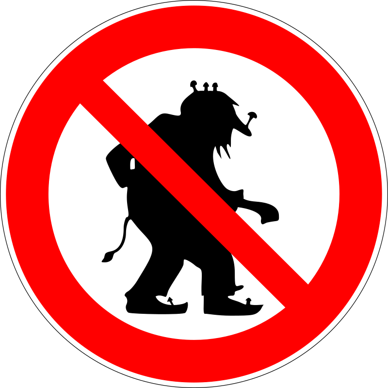 This features a red and white sign with an illustration of a man in black clothing, possibly a monster or a demon. This figure is walking away from the viewer, giving the impression that it is not allowed to be present in the area. The sign has a no entry symbol on it, indicating that access to this particular location is restricted. The image appears to be a close-up of the sign, emphasizing its message and making it clear for viewers to understand.
