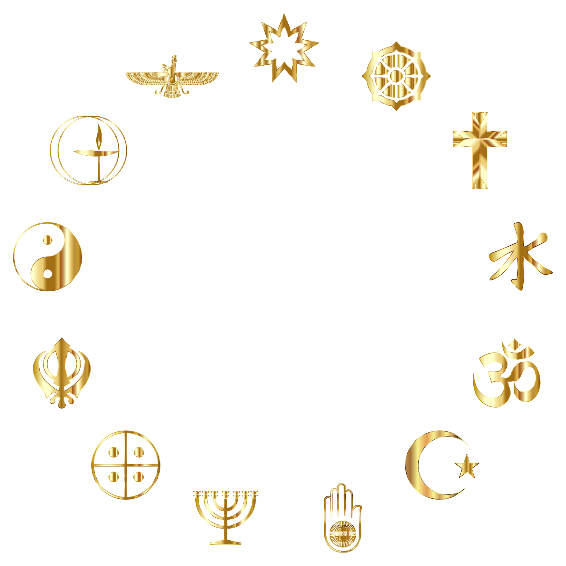 Tags: ahimsa, ahura mazda, baha'i, buddhism, christian, confucianism, confucius, crescent star, cross, dharma wheel, ethics, flaming chalice, golden, hinduism, islam, jainism, judaism, khanda, menorah, metallic, morals, native spirituality, om, religion, shiny, sikhism, star, symbol, taoism, unitarianism, yin yang, zoroastrianism, emblems religious