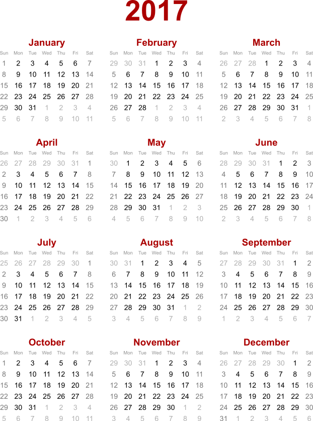 This displays a calendar for the year 2017, featuring each month of the year with its corresponding day. The calendar is organized in a grid-like pattern and has red text indicating the names of each month. The top of the calendar reads "Year 2017," further emphasizing the year being depicted. This calendar serves as a useful tool for keeping track of dates throughout the year, with its clear and organized layout making it easy to read and understand.