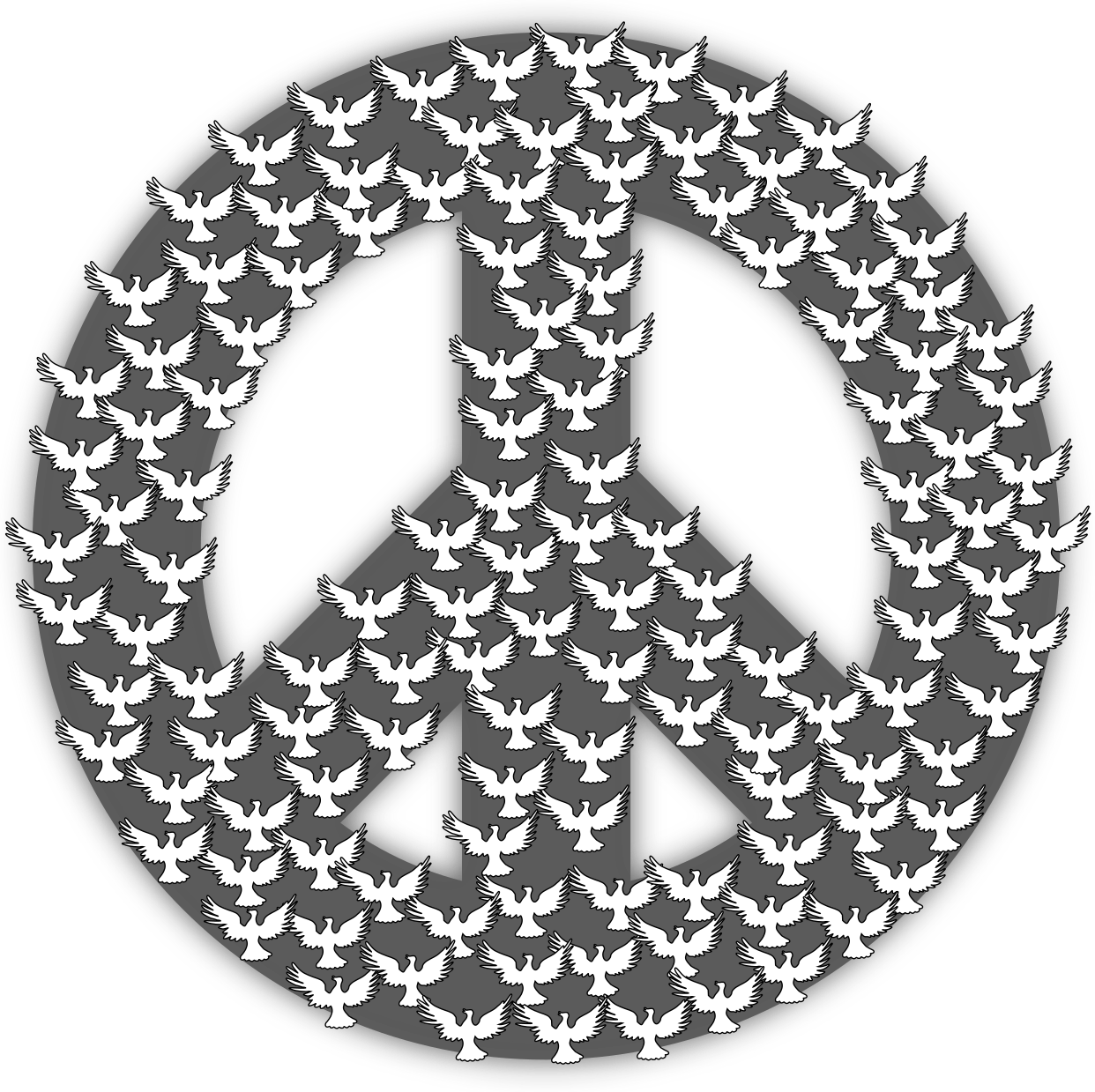 This features a large, round symbol made up of numerous white doves. These birds are scattered all around the symbol in various positions and sizes, creating a sense of unity and harmony. The doves are arranged in such a way that they fill most of the space within the circle, with some even extending beyond its borders. This unique design showcases the peaceful nature of the dove symbol while emphasizing the importance of togetherness and cooperation among individuals or groups.