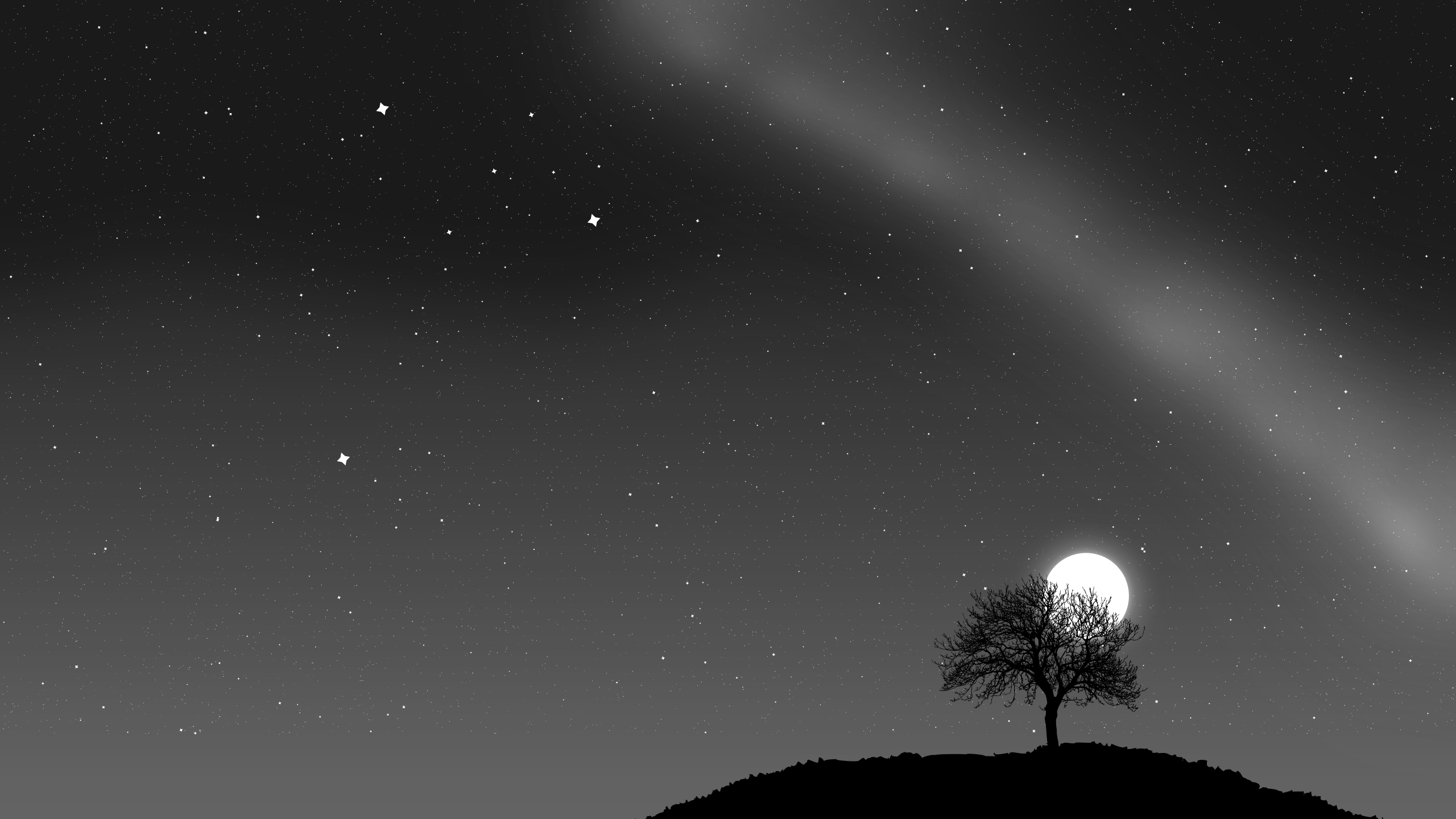 This features a single tree standing alone in the middle of an open field, with a full moon partially hidden behind it. The night sky is filled with stars, creating a serene and peaceful atmosphere. The tree appears to be silhouetted against the backdrop of the starry sky, adding depth and dimension to the scene. This black and white illustration captures the beauty of nature in its most tranquil state.