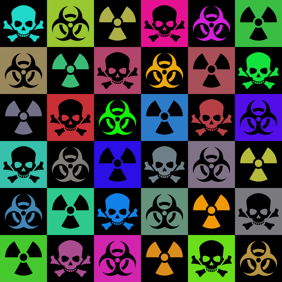 This features a collection of skull and crossbones symbols, each with different colors. There are twelve distinct skulls in total, arranged in a square pattern. Each skull has a unique color, making the arrangement visually appealing and diverse. The skulls vary in size and position, creating an interesting visual effect that captures attention. Overall, this image showcases a creative use of colorful skull symbols to create a striking design.