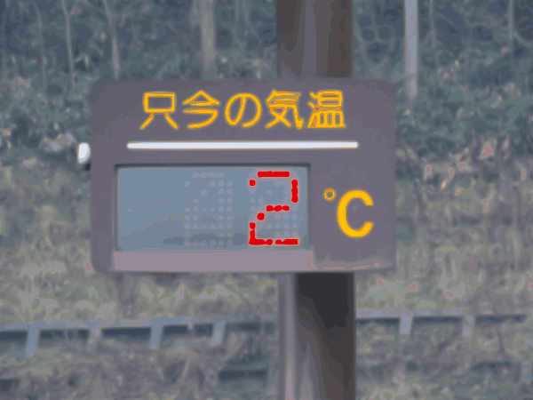 This features a sign with an outdoor temperature displayed in both Japanese and English. The temperature is currently 2 degrees Celsius, which translates to 35.6 degrees Fahrenheit. The sign is located near train tracks, indicating that it might be at a train station or a location where people frequently travel by train.
