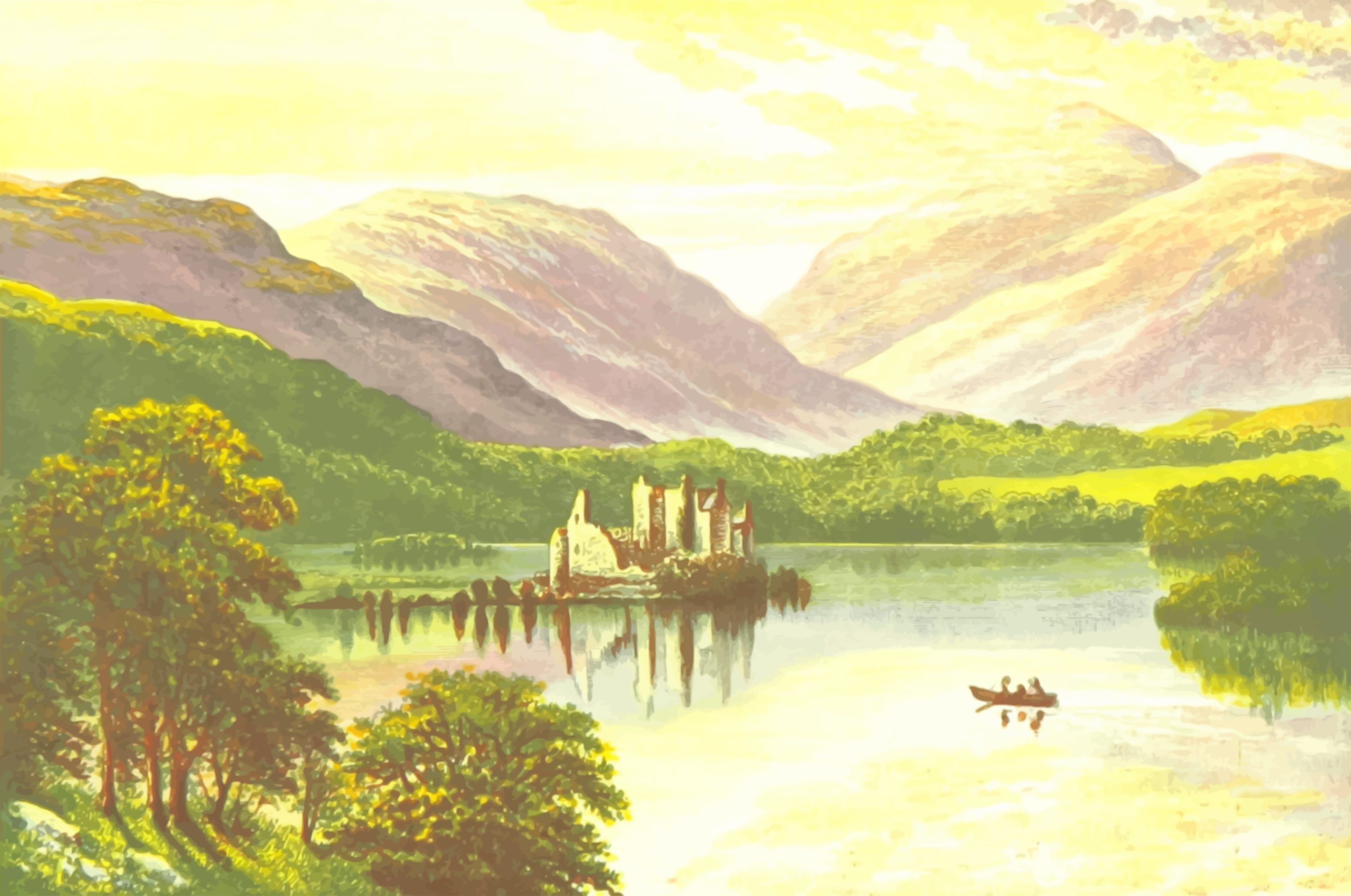 This depicts a serene scene of a lake surrounded by mountains. A castle can be seen in the distance, situated on an island in the middle of the lake. There are several boats floating on the water, with one boat closer to the foreground and two others further away. The overall atmosphere is peaceful and picturesque, showcasing the beauty of nature and architecture.