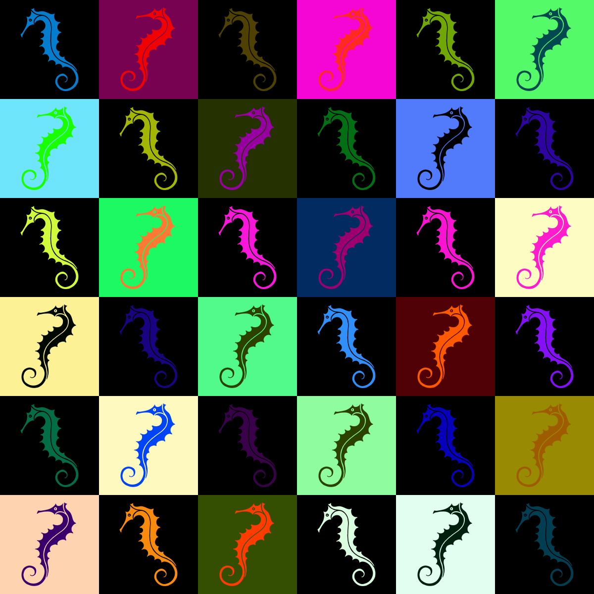 This showcases a collection of colorful seahorses arranged in various patterns. There are twelve different colored seahorse designs, each with unique features and varying shades. These seahorses are displayed in squares, creating an intricate and visually appealing arrangement. The colors used for the seahorses include blue, green, red, yellow, pink, orange, purple, black, white, and brown. This artistic display of seahorse designs creates a captivating visual experience that highlights the beauty and diversity of these creatures.