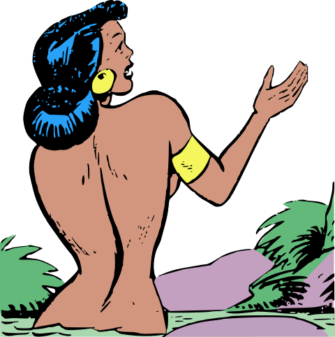 This features a woman with long black hair, wearing a yellow cuff around her right arm and yellow earrings. She is standing in light green water, possibly a river or a lake, and has one arm raised in the air. Her backside is prominently displayed, showcasing her curves and beauty. The scene appears to be from an animated cartoon or comic book, with the woman's body drawn in a vibrant color palette that contrasts with the more subdued green water.