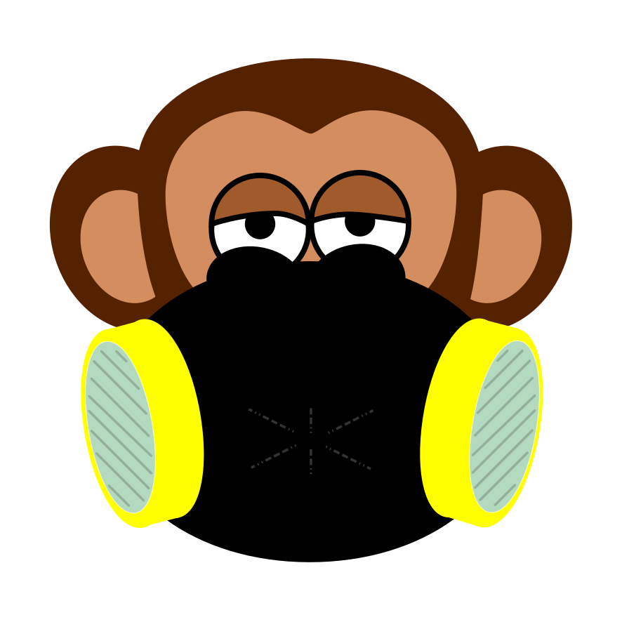 This features a cartoon monkey wearing a gas mask, which is an interesting and unique design element. The monkey's face is covered with the mask, giving it a playful appearance. The gas mask is yellow in color, adding to its distinctive look. This creative representation of a gas mask on a monkey could be used as a symbol for environmental awareness or air quality concerns.