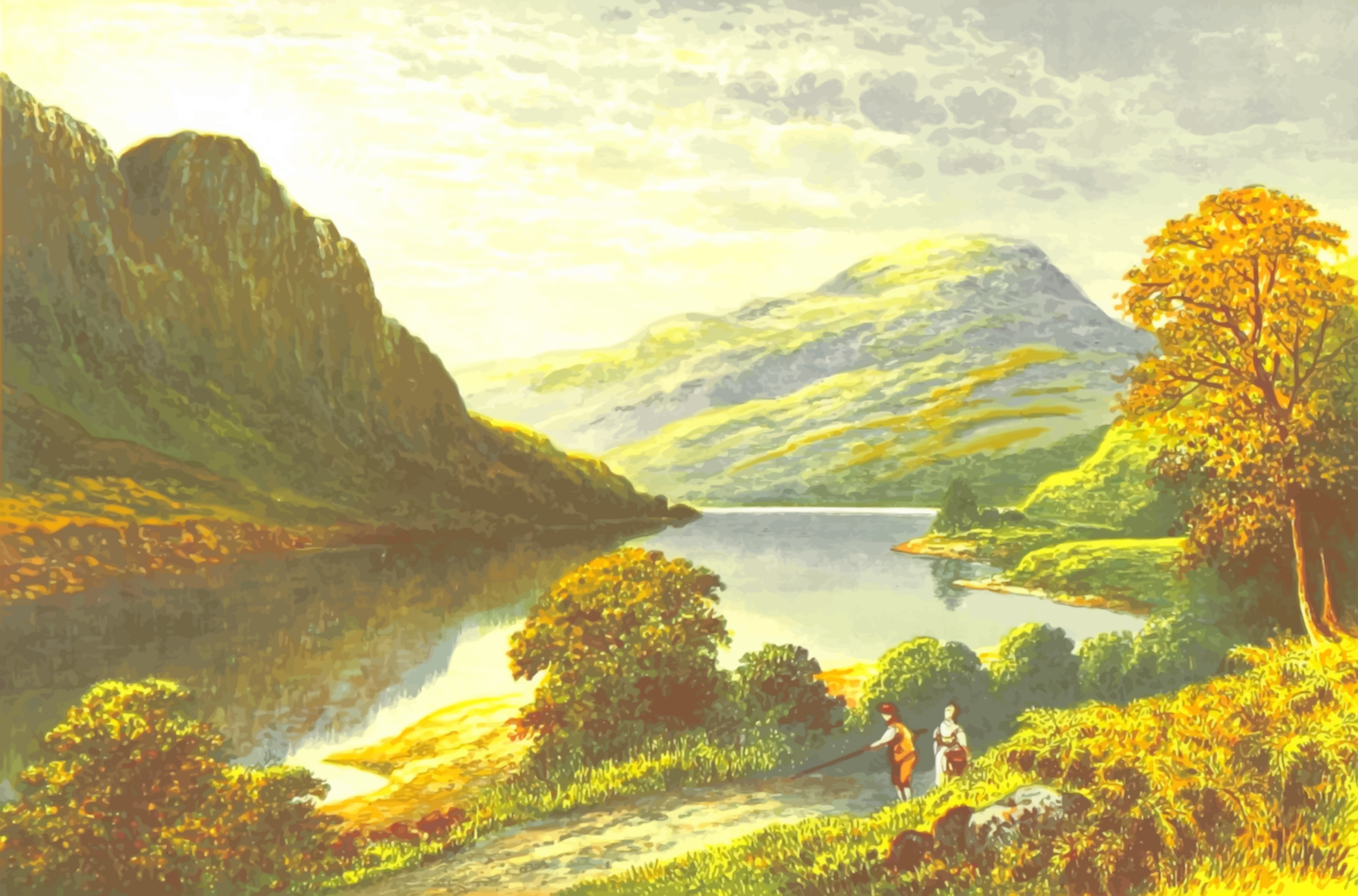 This depicts a serene scene of two people walking along the shore of a lake, surrounded by lush greenery. They are accompanied by their dog as they enjoy the beautiful view of the mountains in the background. The couple is carrying fishing rods, suggesting that they might be spending time together engaging in outdoor activities such as fishing or simply enjoying the peaceful atmosphere. The presence of trees and grass adds to the natural beauty of the scene, making it an idyllic representation of a leisurely day spent by the water.