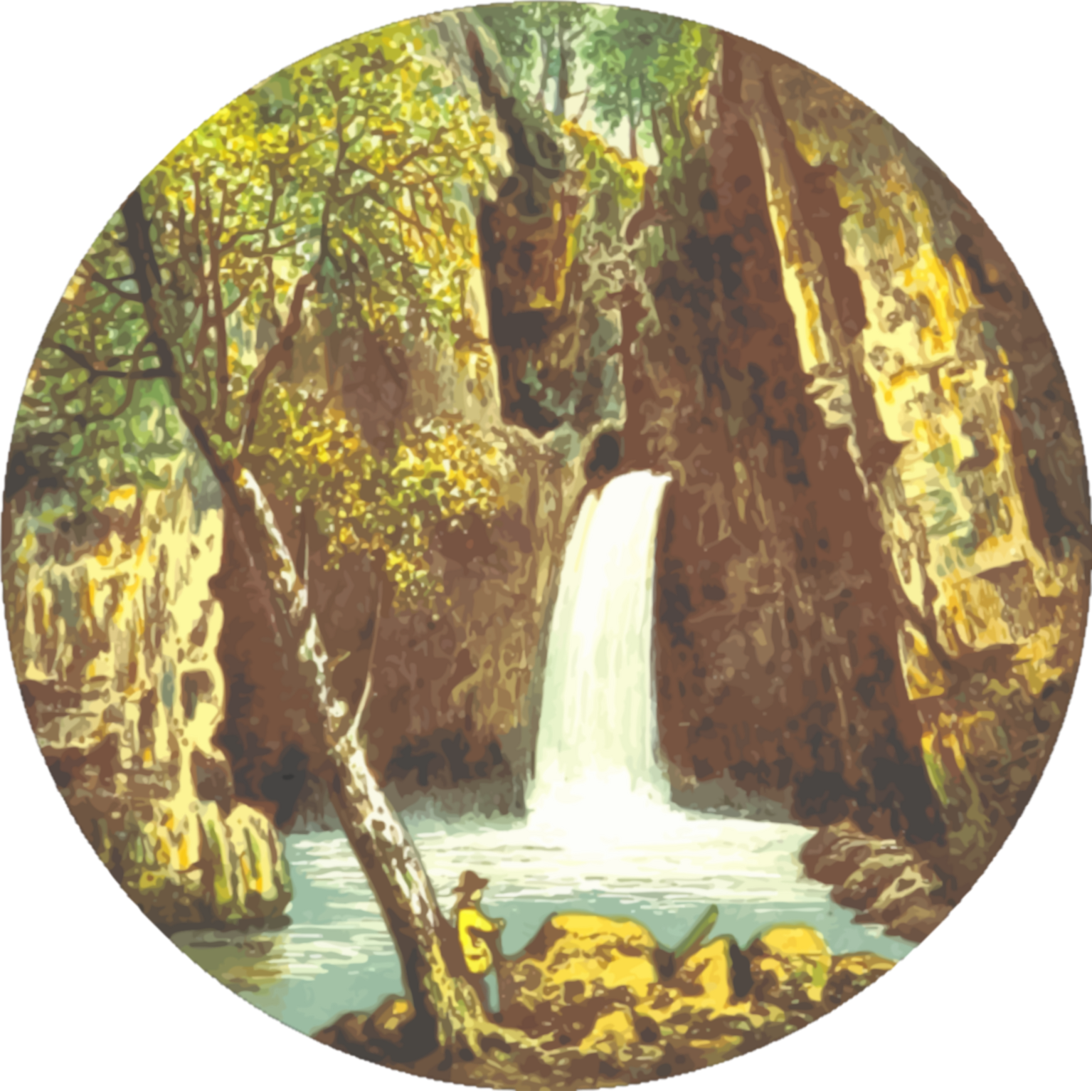 This is a painting of a waterfall in the middle of a forest. A man can be seen standing near the base of the waterfall, possibly admiring its beauty or preparing to climb it. The scene captures the essence of nature and adventure, as the man appears to be exploring this natural wonder. The painting is set against a backdrop of trees, rocks, and mountains, creating an atmosphere of tranquility and serenity.