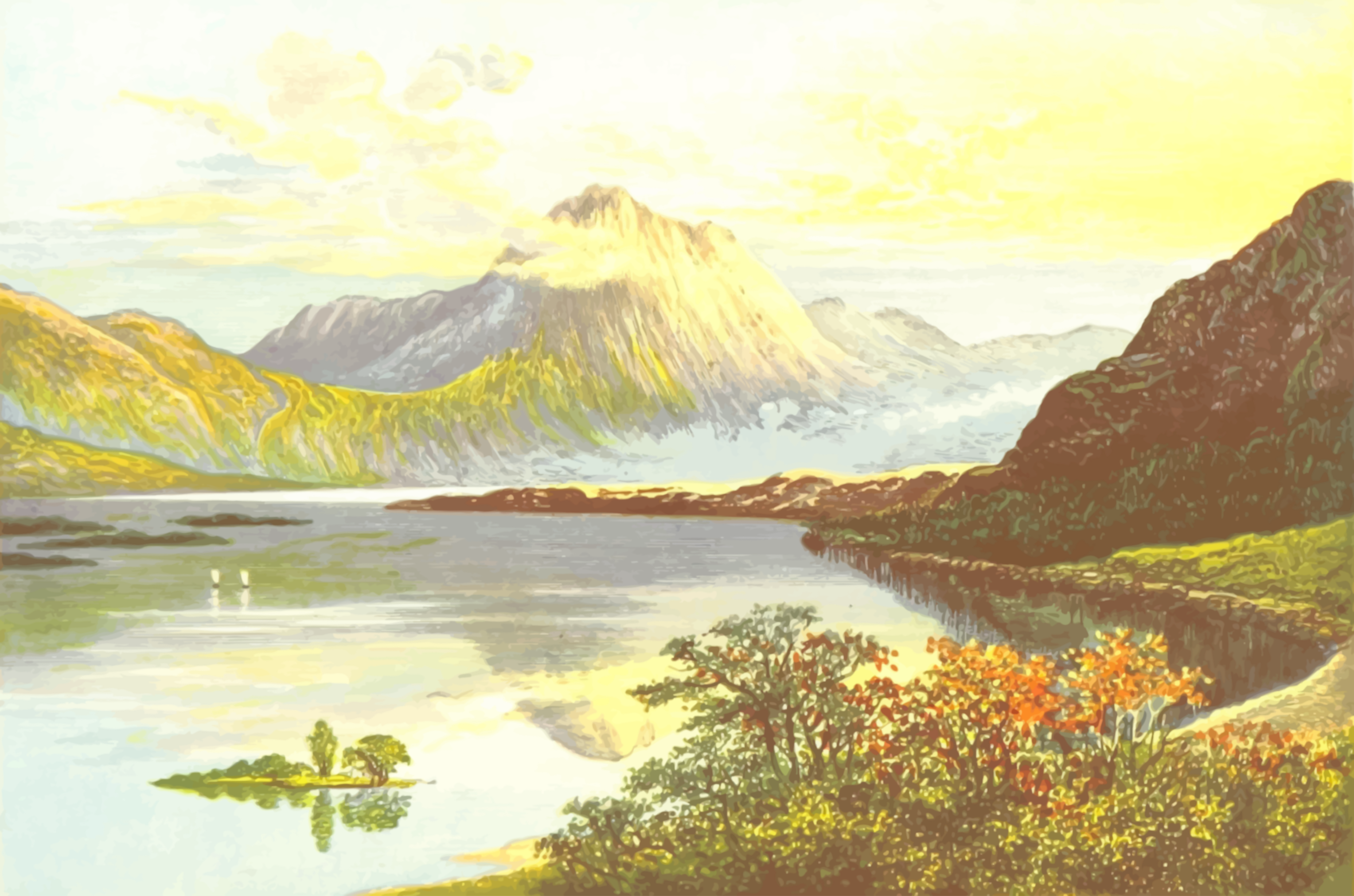 This features a serene scene of a lake surrounded by mountains. A small island can be seen in the middle of the water, adding to the picturesque view. In the distance, there are two large mountains with clouds hovering around their peaks, creating an atmosphere of tranquility and natural beauty. The landscape is further enhanced by the presence of trees lining the shores of the lake, providing a sense of depth and dimension to the scene. Overall, this painting captures the essence of a peaceful and idyllic mountain setting.