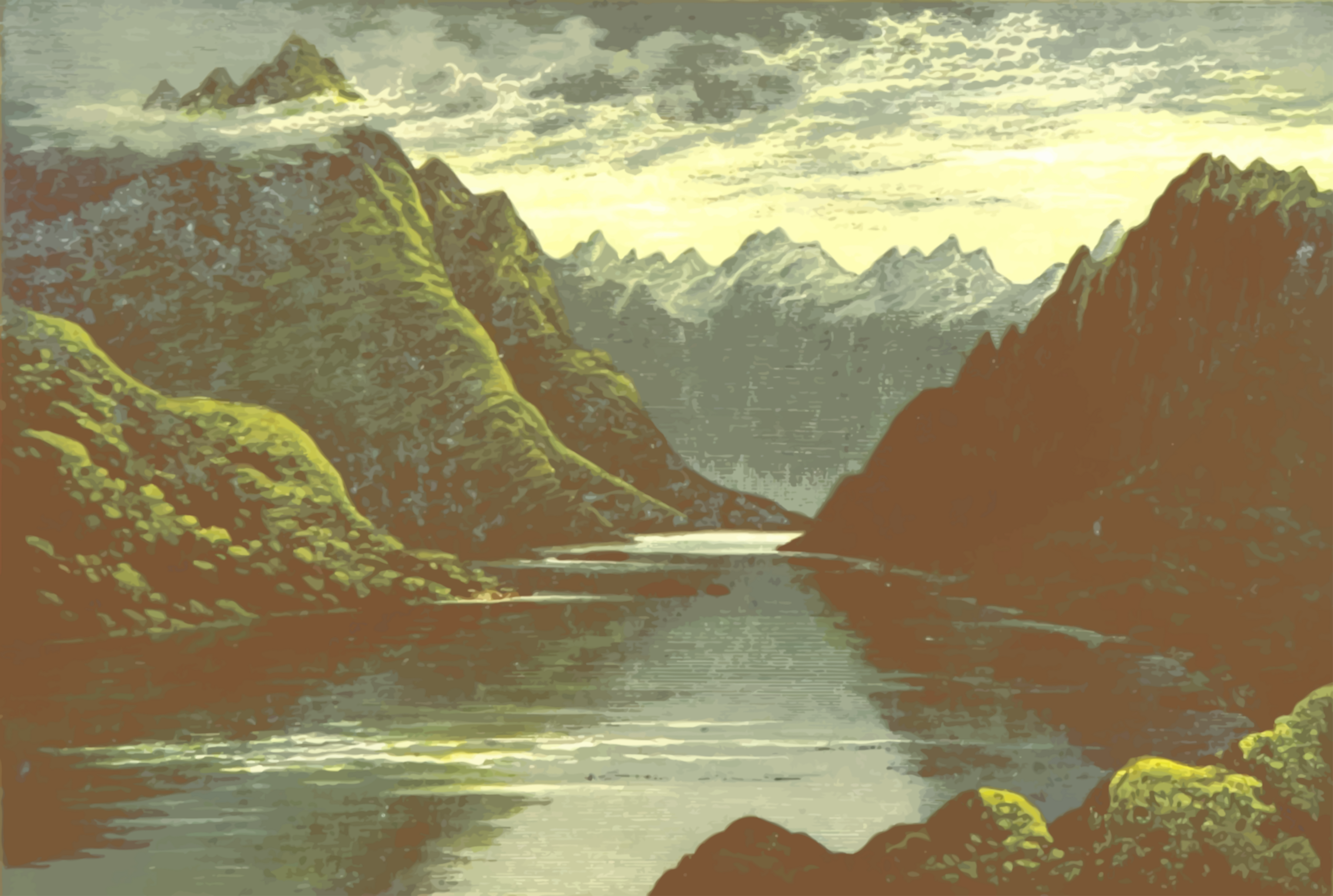 This features a beautiful mountain landscape with a large body of water, possibly a lake or river. The mountains are covered in lush greenery and have snow-capped peaks, creating an idyllic scene. A few trees can be seen scattered throughout the area, adding to the natural beauty of the environment. The water appears calm and serene, reflecting the tranquility of the landscape. This picturesque setting is perfect for outdoor enthusiasts or those seeking a peaceful retreat from urban life.