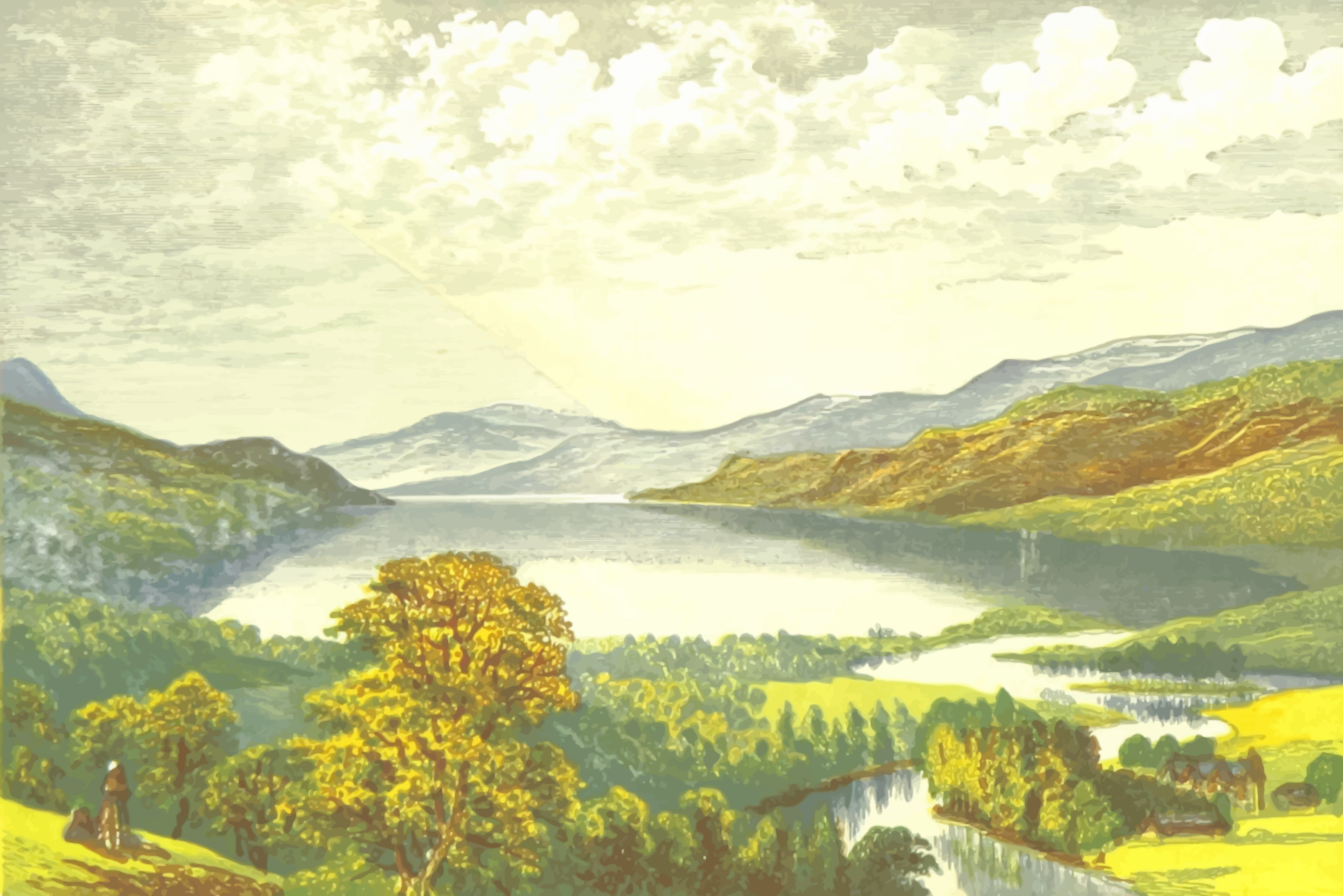 This depicts a serene landscape with mountains in the background and a large body of water, possibly a lake or river. There are several trees scattered throughout the scene, adding to the natural beauty of the environment. A person can be seen standing near the edge of the water, likely enjoying the view or taking a stroll through the picturesque surroundings. The overall atmosphere is peaceful and inviting, making it an ideal setting for relaxation and contemplation.