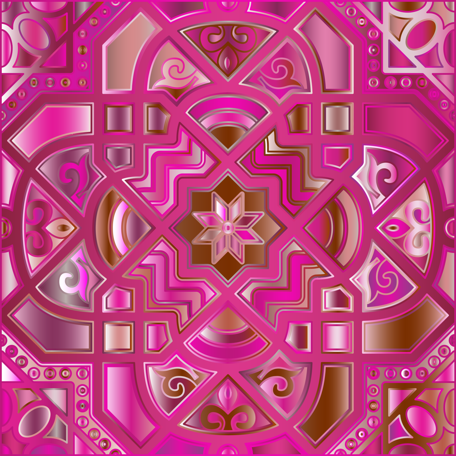 This features a pink and brown design with an intricate pattern. It appears to be a close-up of the center of the design, which is surrounded by a decorative border. The color scheme consists of shades of pink and brown, creating a visually appealing contrast. The design itself seems to have a combination of geometric shapes and floral elements, giving it an artistic and elegant appearance. Overall, the image showcases a beautifully crafted piece of art or decoration that stands out with its vibrant colors and intricate patterns.