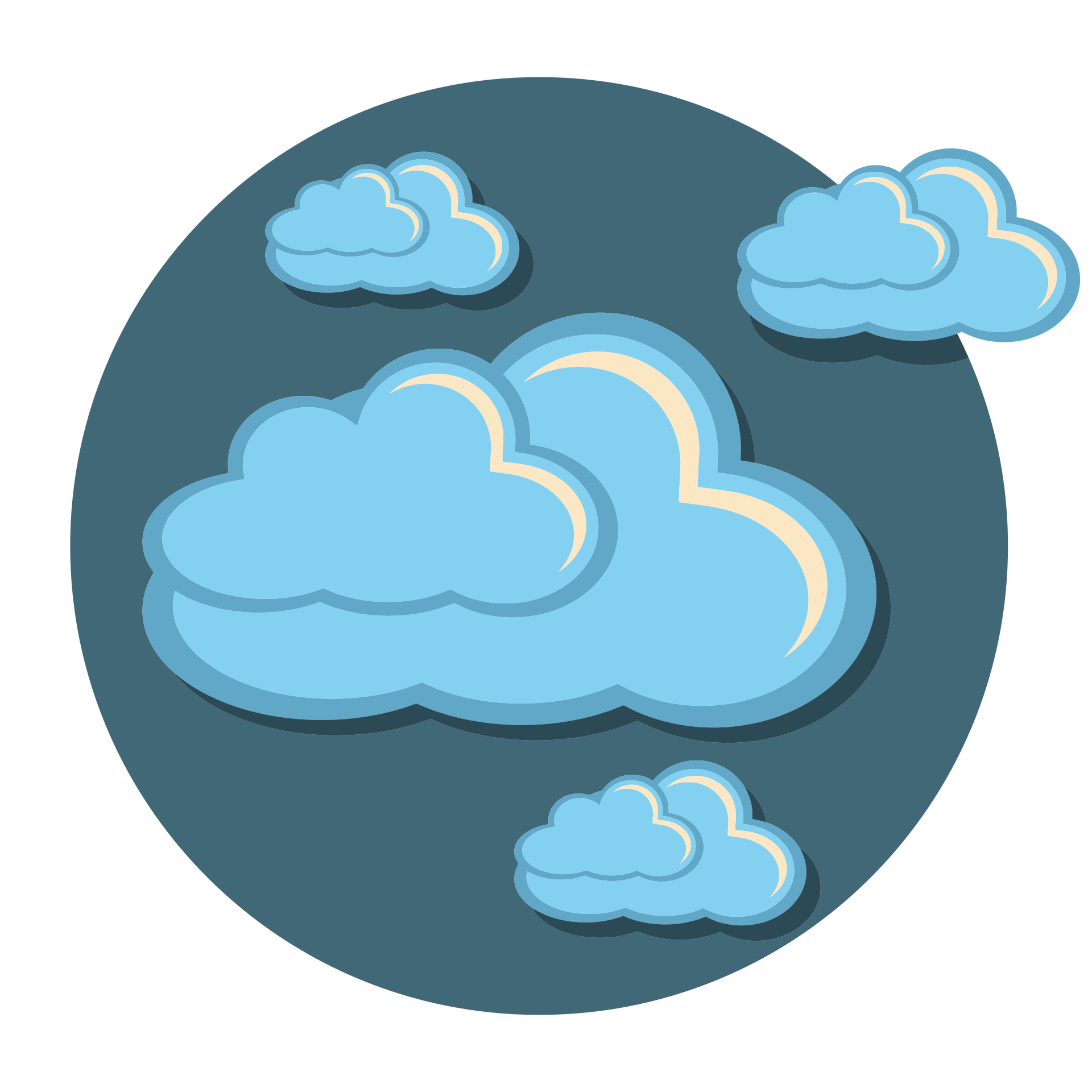 This features a round, blue circle with various cloud shapes floating around it. These clouds are of different sizes and colors, creating an interesting visual effect. Some of the clouds are larger and more prominent, while others are smaller and less noticeable. Overall, the scene is lively and captivating, showcasing the beauty of nature through these cloud formations.