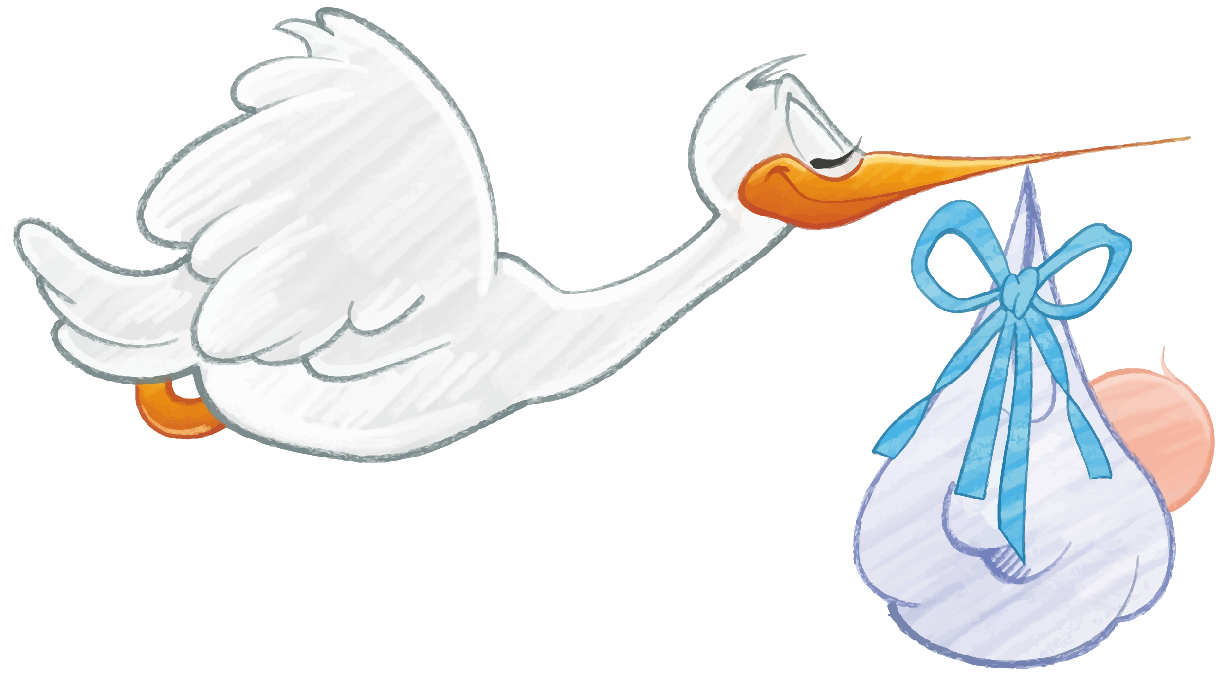This features a cartoon illustration of a white stork carrying a baby boy in its beak. The baby is nestled comfortably within the stork's grasp, and they are both positioned above a bundle that has a blue bow tied around it. This whimsical scene captures the essence of a traditional fairy tale or storybook illustration, where a magical creature like a stork takes care of a baby in need. The combination of the stork's gentle touch and the baby boy's innocent expression creates an endearing atmosphere that appeals to viewers of all ages.