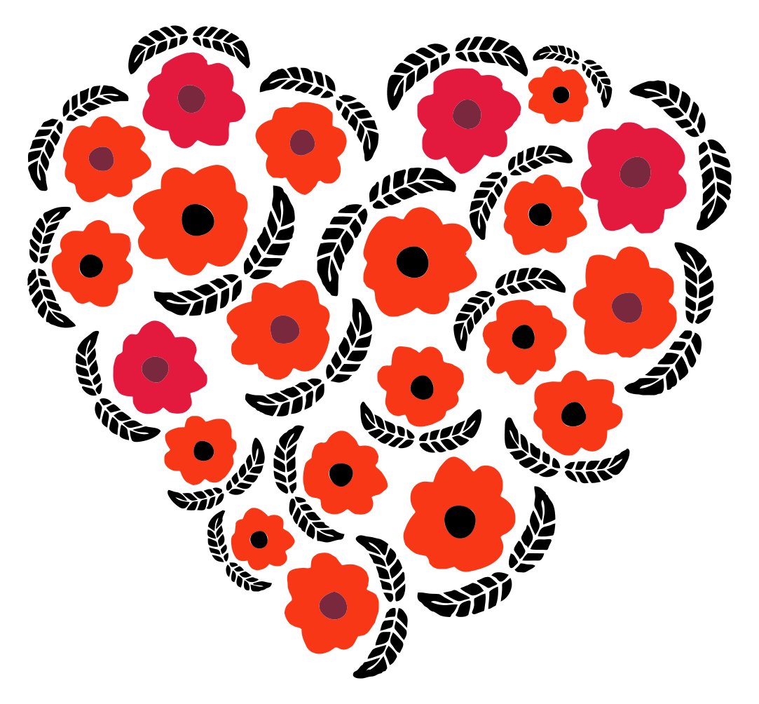 This features a heart-shaped design made up of numerous red flowers, each adorned with black floral leaves. These flowers are scattered throughout the heart in various positions and sizes, creating an intricate pattern that covers most of the shape. The overall effect is a visually appealing and artistic representation of love or affection.
