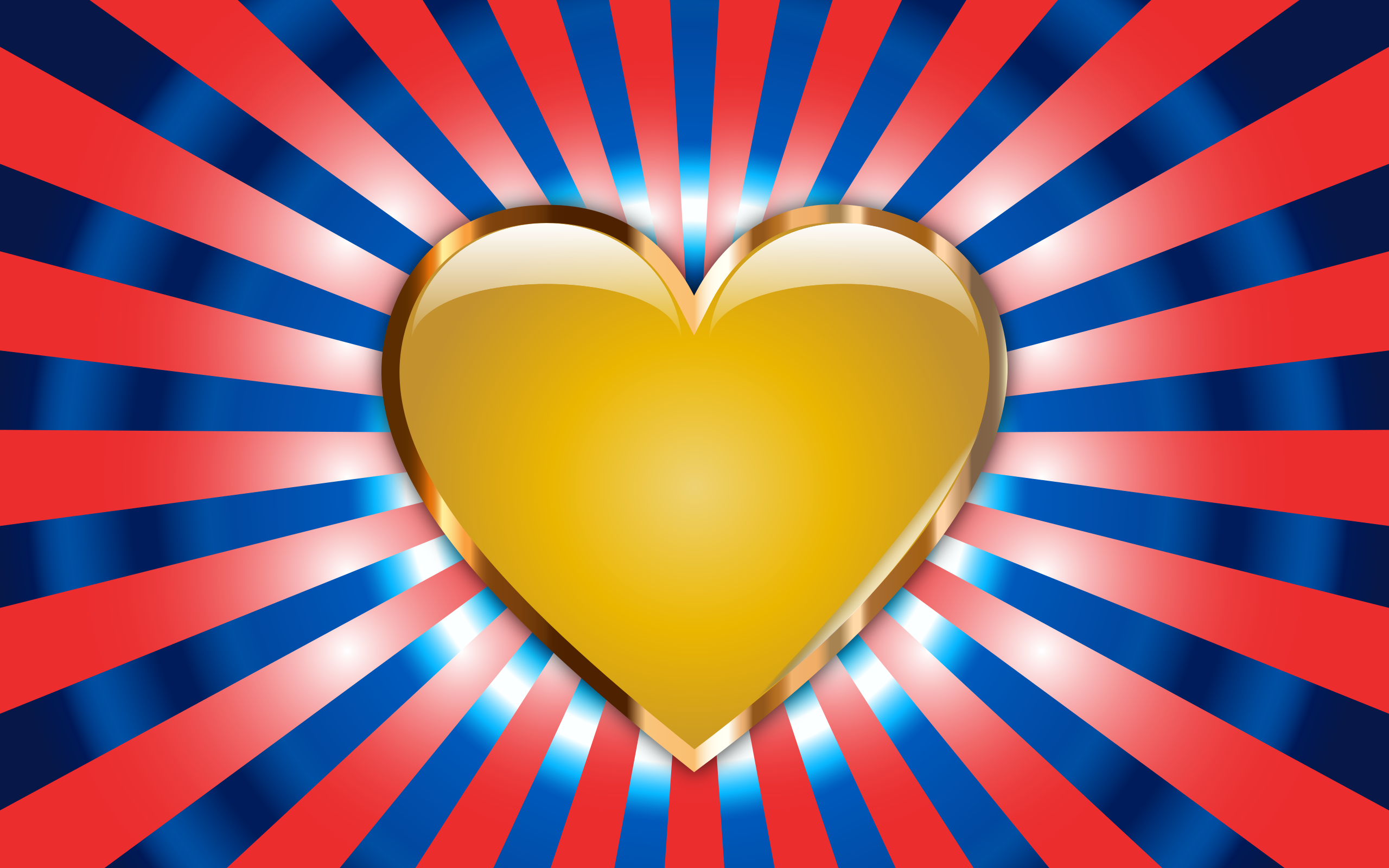 This features a golden heart, which is the central focus of the scene. It is surrounded by a starburst background made from red and blue rays, giving it an eye-catching appearance. The heart appears to be shining brightly in the center of the starburst pattern, creating a visually appealing composition. This design could be used for various purposes such as decoration or even as a logo, with its bold colors and unique shape making it easily recognizable.