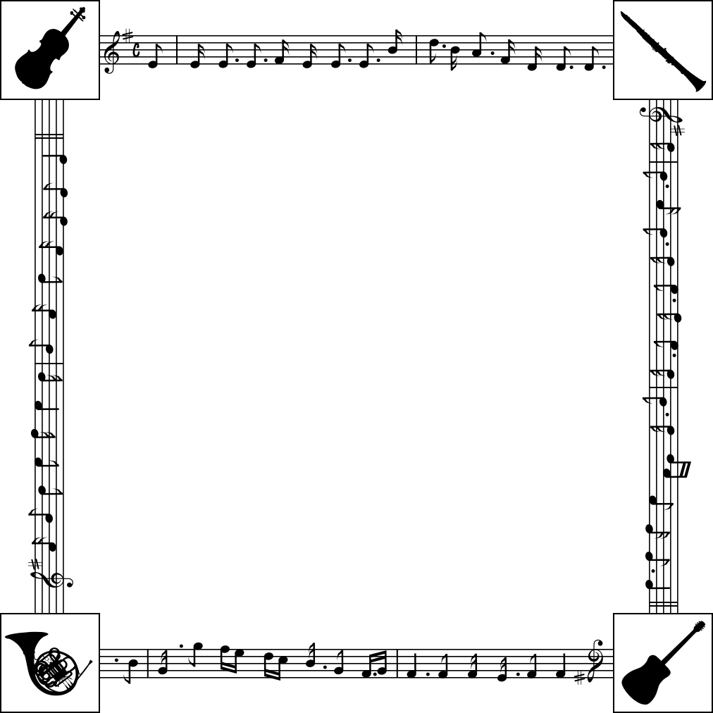 This features a black and white frame made from musical scores. In each corner of the frame, there is a square with a picture of a musical instrument in it. In the top left corner, there is a picture of a violin. In the top right corner, there is a picture of a clarinet. In the bottom right corner, there is a picture of a guitar, and in the bottom left corner, there is a picture of a tuba. The frame appears to be a unique piece of artwork that showcases musical instruments in an unconventional manner.