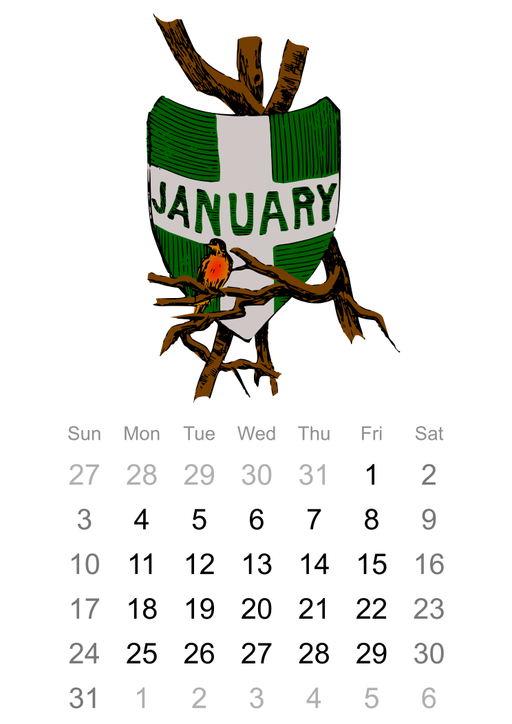 This features a calendar with the month of January displayed. On this calendar, there is an illustration of a tree branch with a bird perched on it. The bird appears to be sitting in front of a green and white banner that reads "January." This unique design adds a touch of creativity to the calendar.