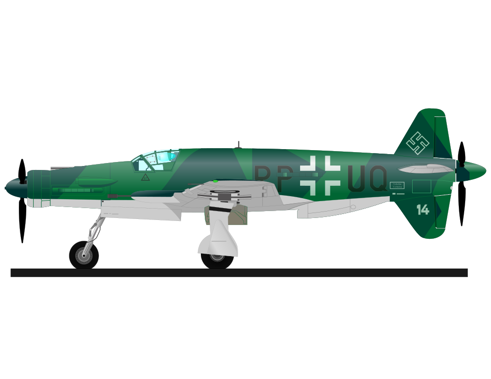 This features a green and white airplane with the letters "D-PRUO" on its side. It is an old military plane, possibly used by the Nazis during World War II. The aircraft has two propellers on each wing, one at the front and another at the back. There are also two wheels visible underneath the airplane, likely for landing or takeoff purposes. The overall appearance of the plane suggests its historical significance and connection to a past military conflict.